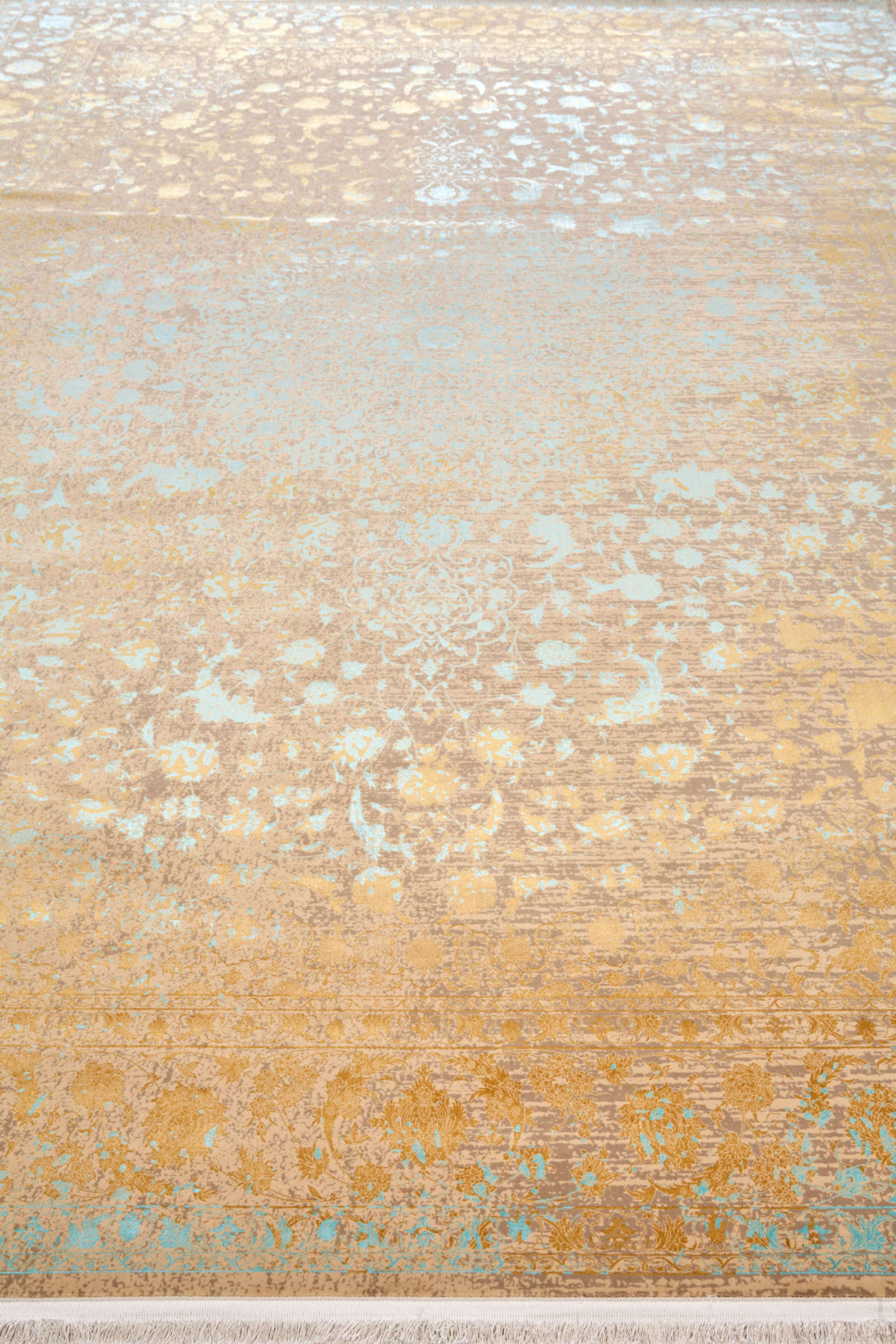 Роскошный ковёр словно застывшая симфония света, где золотые блики танцуют на нежно-голубом фоне. Его бархатистая поверхность манит прикоснуться к этому произведению искусства. Абстрактные узоры напоминают брызги расплавленного золота, создают ощущение невесомости и изысканной роскоши.