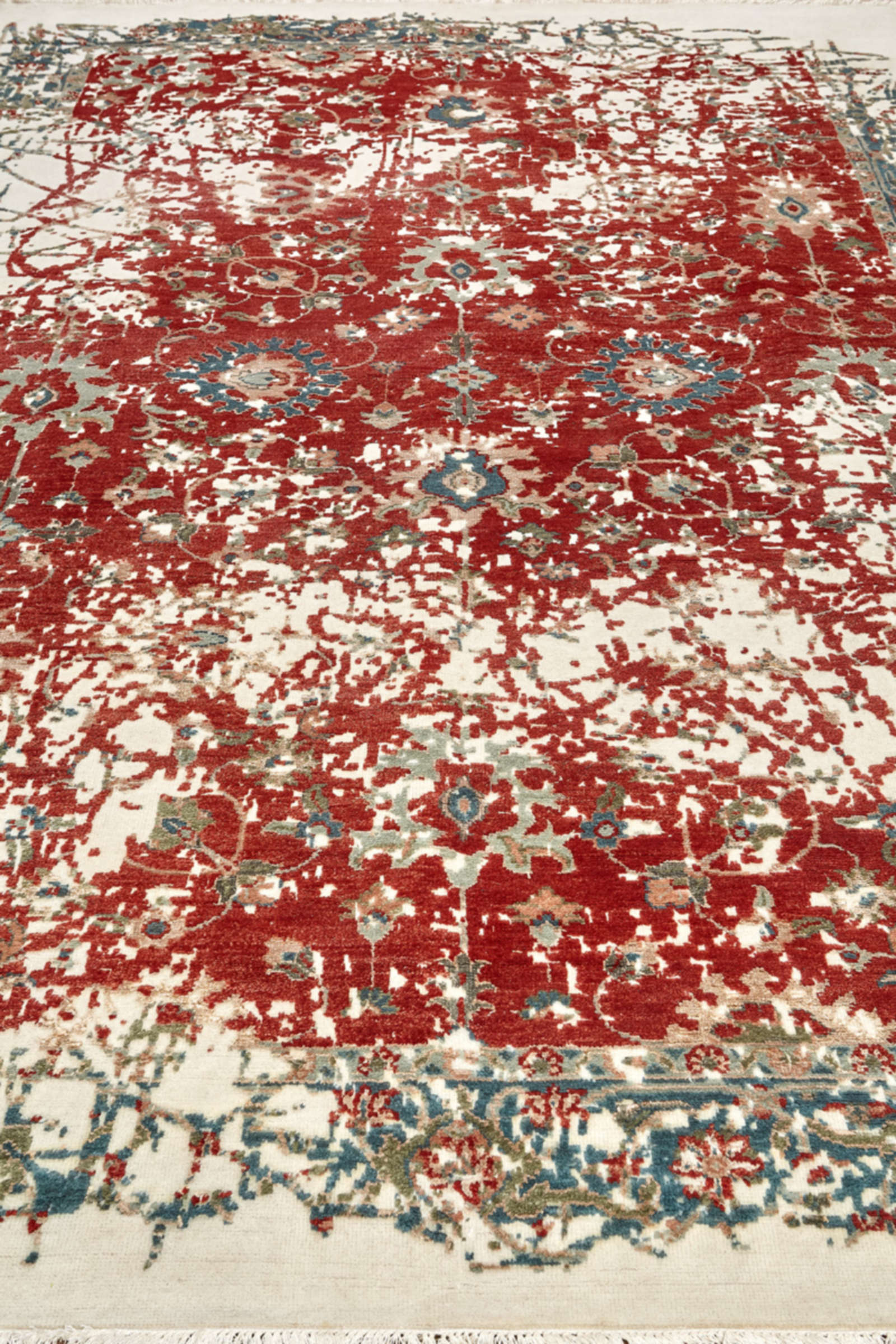 Этот ковёр украшен красным фоном с цветочным узором, будто проступающим сквозь патину времени. Его винтажный характер добавляет интерьеру глубину и драматизм. Такой ковёр — словно история, рассказанная тканью.