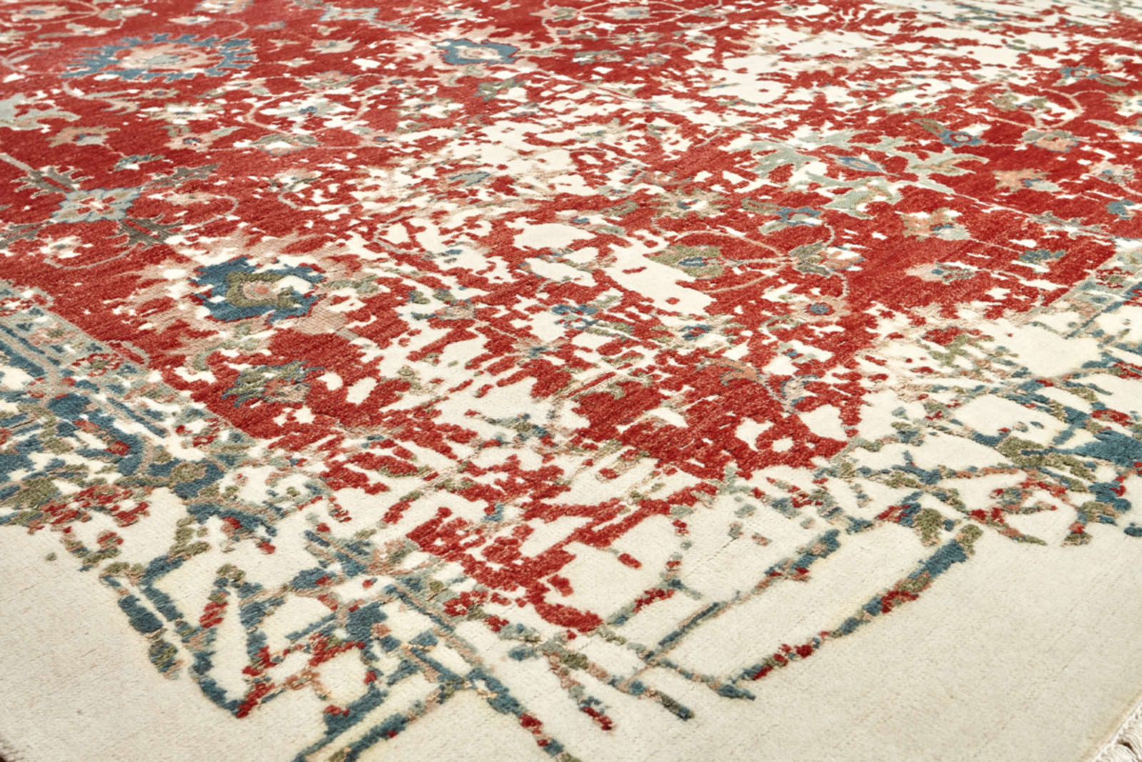 Этот ковёр бренда VISIONER, созданный вручную индийскими мастерами, словно фрагмент старинного гобелена. Его насыщенный красный фон украшен цветочным орнаментом, частично стёртым и обрамлённым винтажной каймой. В этом рисунке есть дыхание времени: он выглядит так, будто пережил десятки лет и сохранил только главное — красоту и ритм. Свет играет на ворсе, рождая мягкое мерцание и подчёркивая глубину цвета. Такой ковёр станет выразительным акцентом в интерьере: он идеально подойдёт для гостиной или кабинета, где важна атмосфера статуса. В современном пространстве будет сочетаться с минималистичной мебелью, превращаясь в художественный центр комнаты.