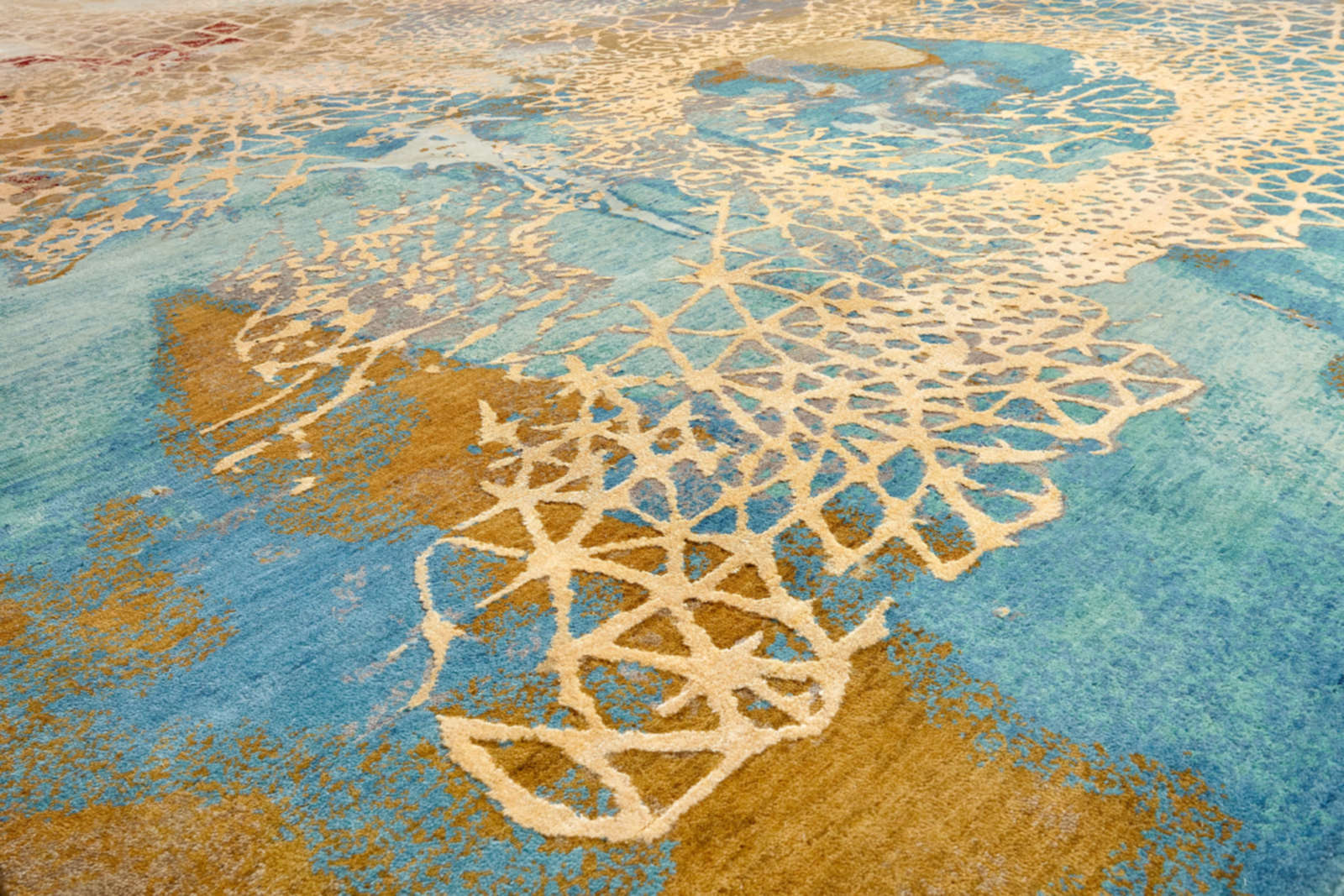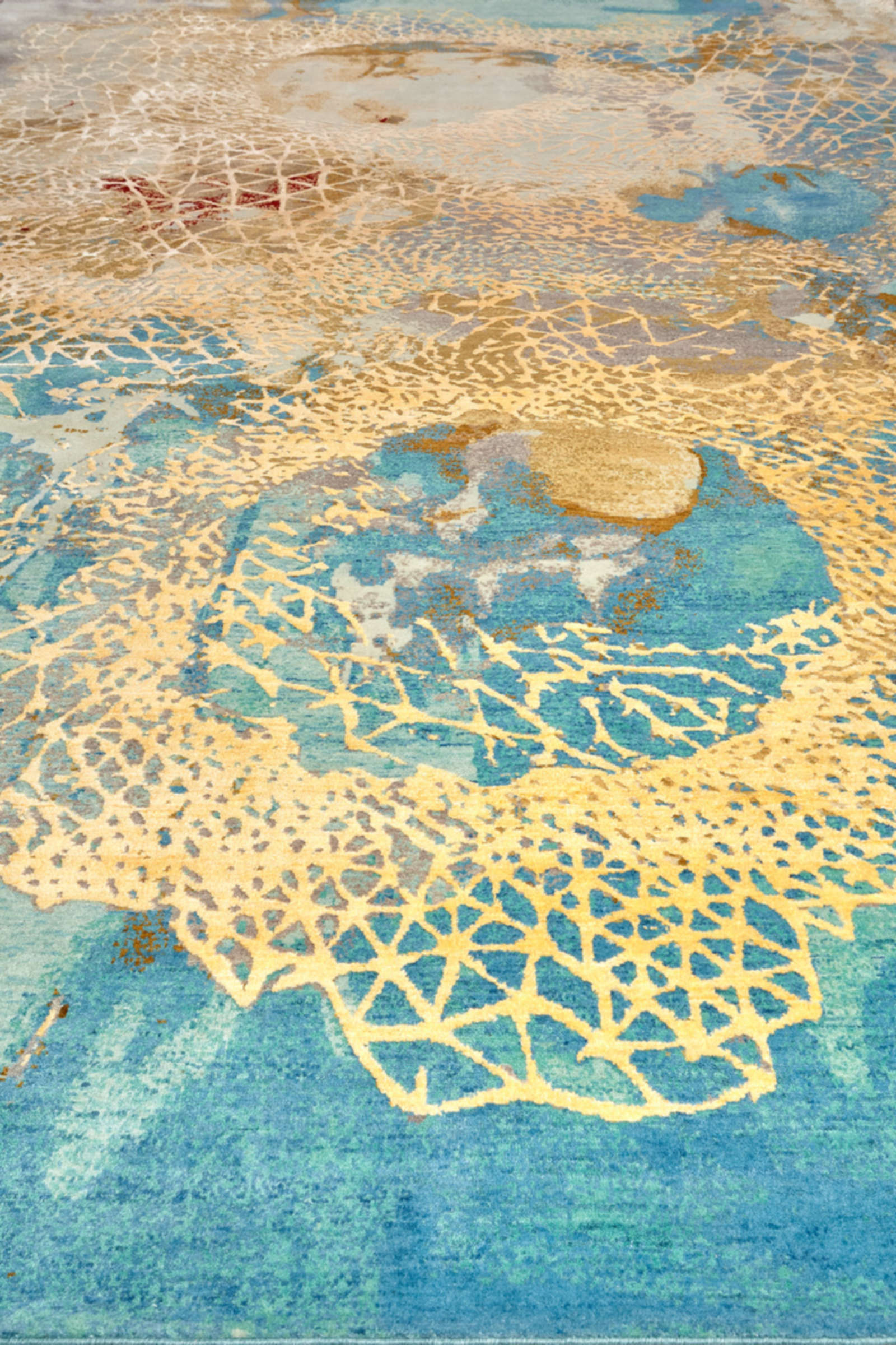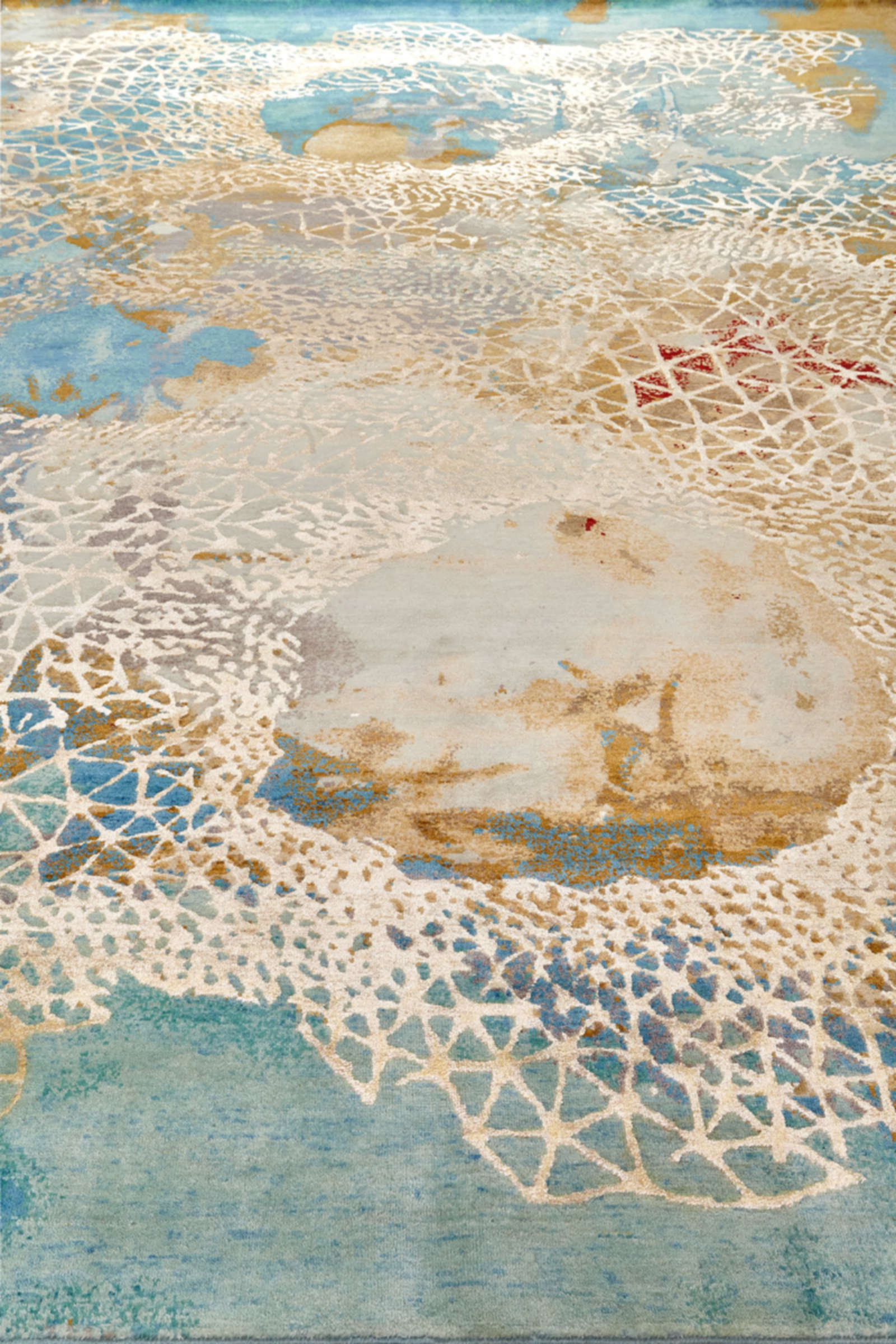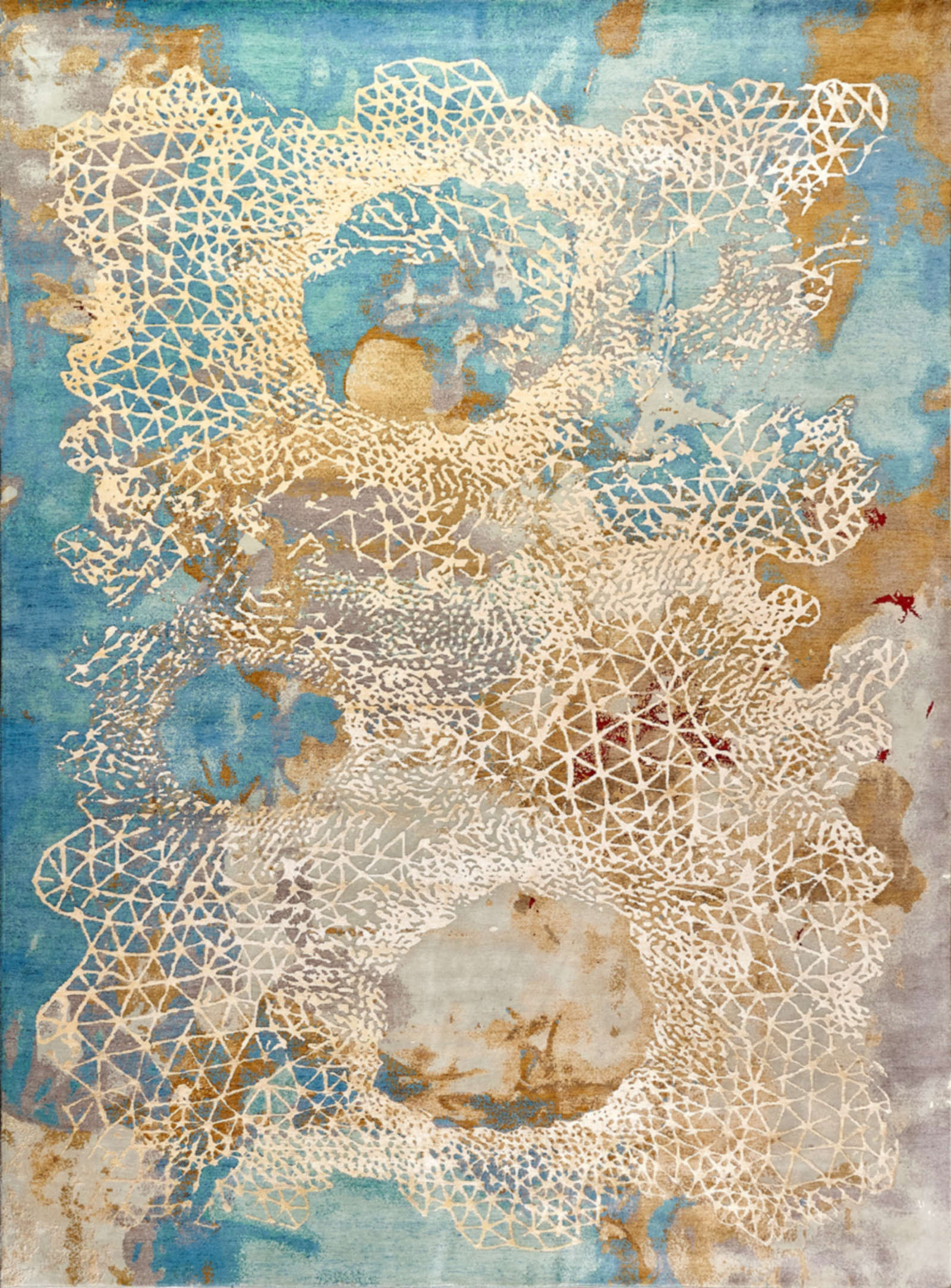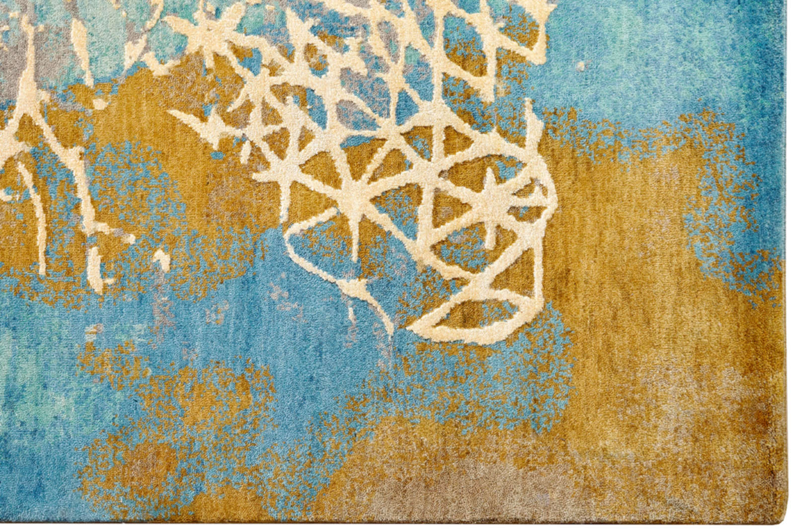 Этот ковёр напоминает фрагмент Вселенной — голубые акварельные переливы переходят в золотистые облака, а поверх проступает тонкая белая сетка, похожая на кристаллическую решётку или кружево из света. В нём одновременно читается научная графика и поэтичный жест, как будто художник нарисовал формулу мечты. Такой ковёр становится арт-объектом: он задаёт динамику в минималистичном пространстве, поддерживает смелую эклектику, придаёт глубину современному интерьеру. Хорошо раскрывается в больших комнатах с дневным светом, где сияющая структура словно оживает и превращает пол в холст. Такой ковёр идеально подойдёт для интерьеров в стиле ар-деко, современный минимализм или эклектика, где ценится художественная выразительность.