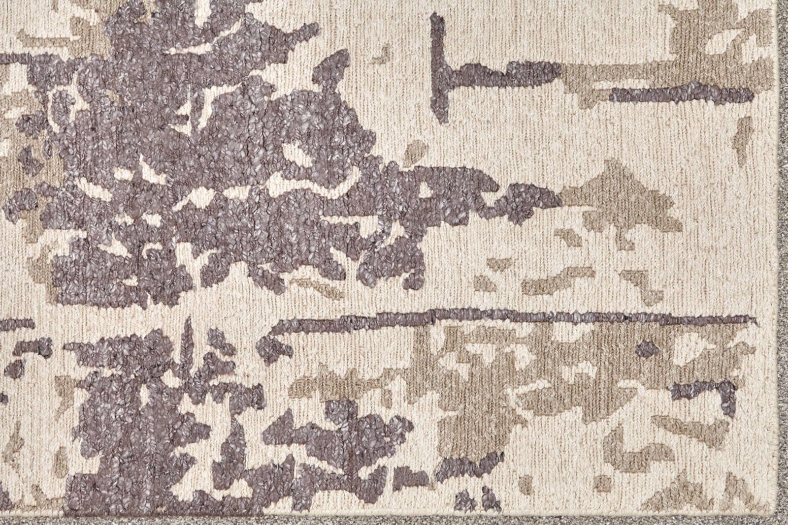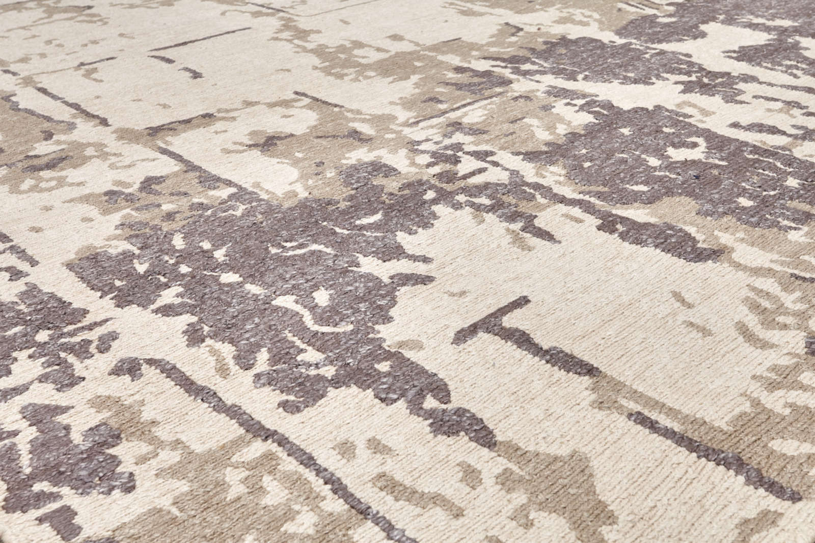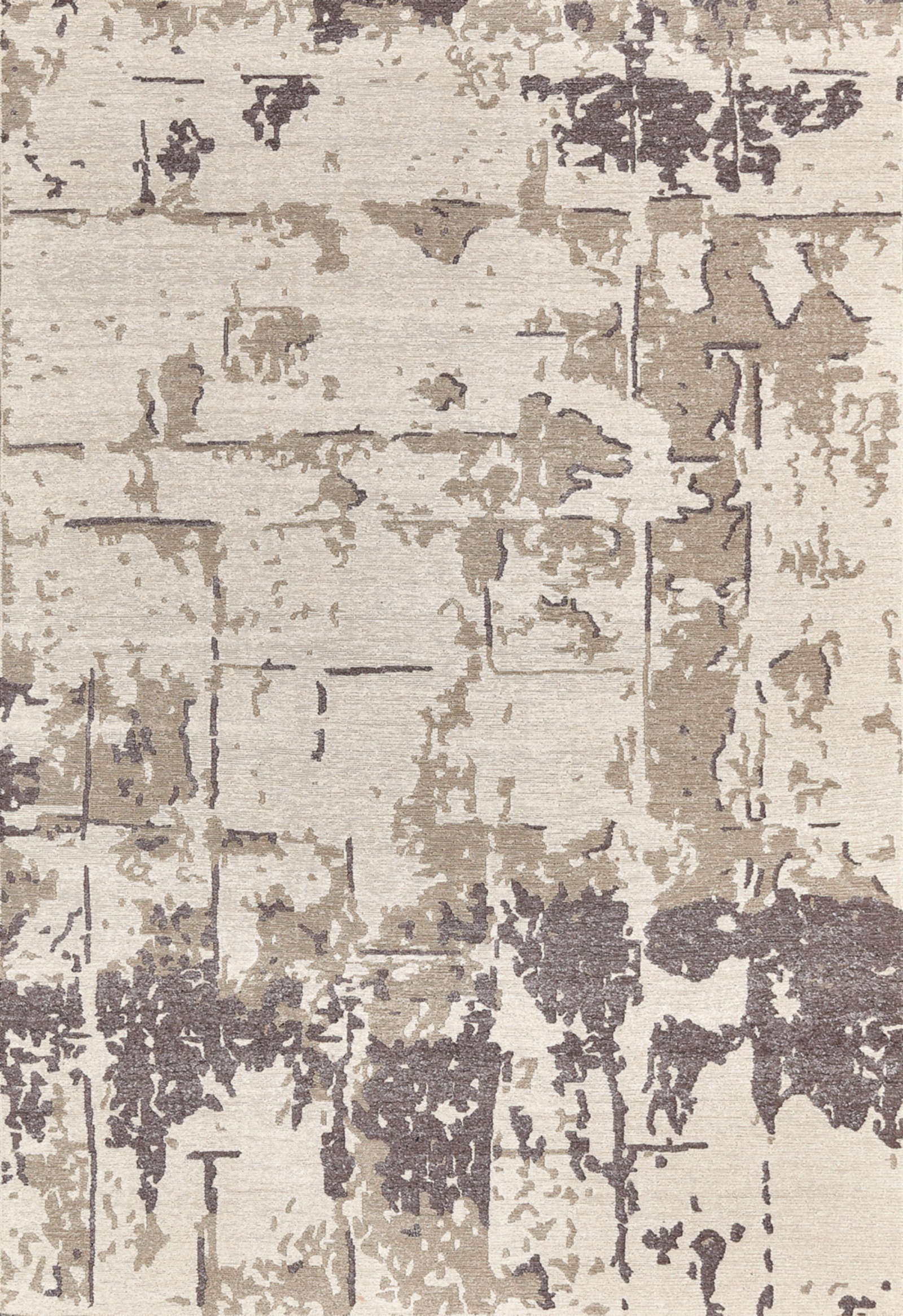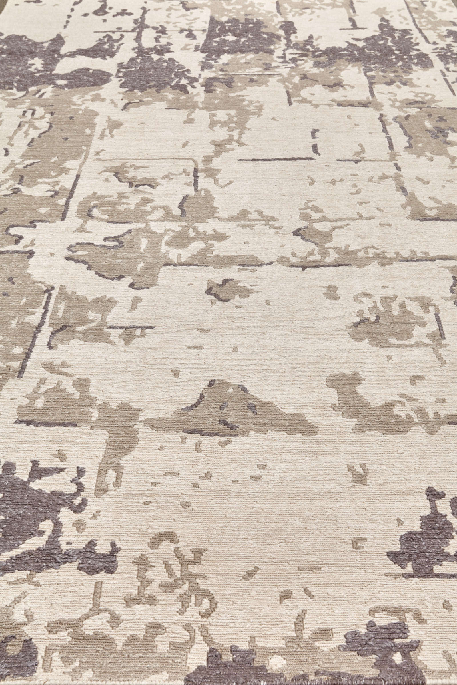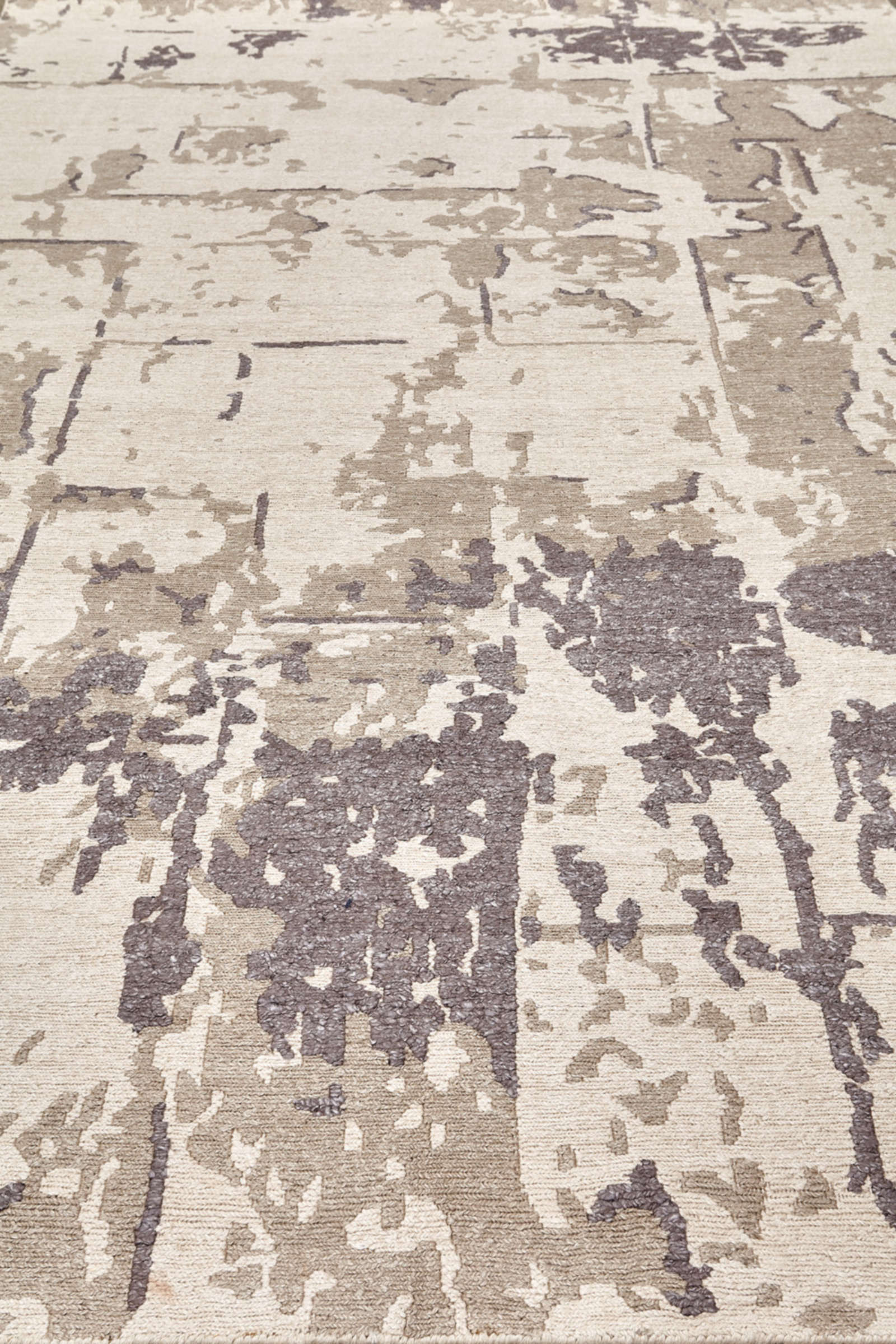 Современный ковёр с абстрактным рисунком в серо-бежевой гамме. Его фактура напоминает игру света на камне или следы старинной фрески. Тонкая работа оттенков создаёт глубину и динамику, превращая ковёр в выразительный арт-объект для стильного интерьера.