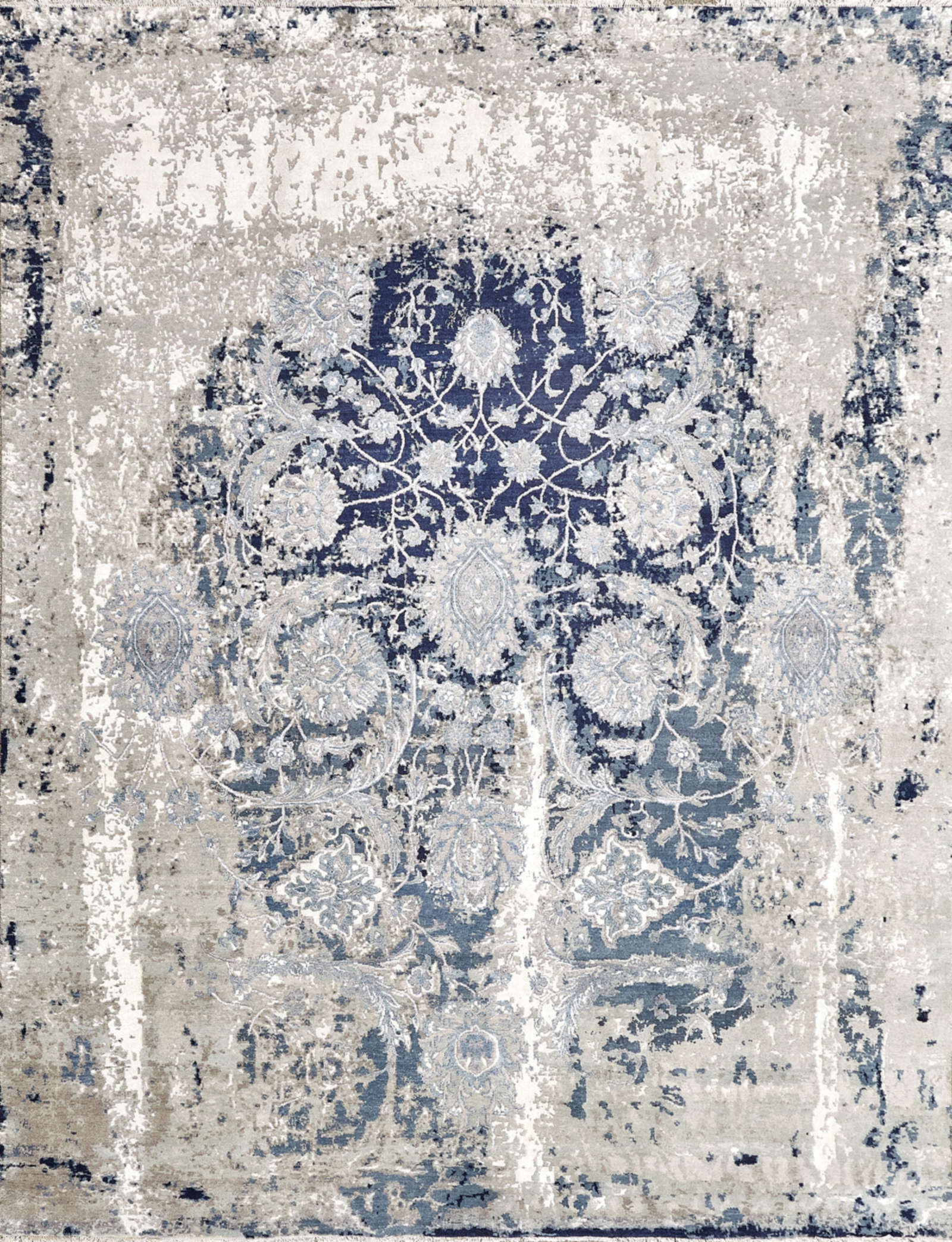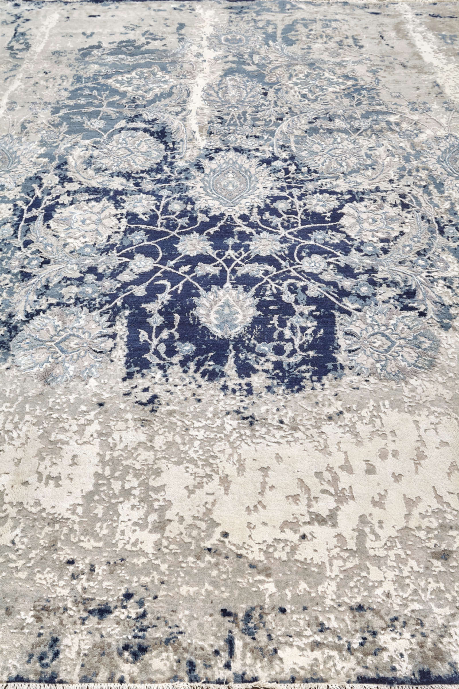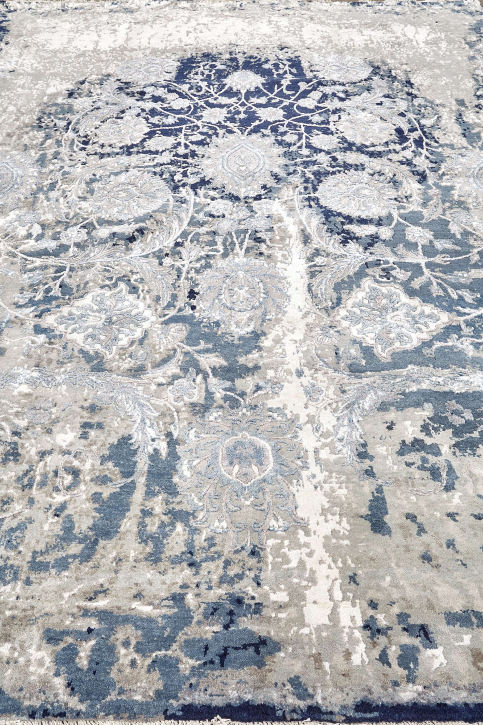 Индийский ковёр ручной работы соединяет классику и современность. Его глубокий сине-серый орнамент, проступающий сквозь «потёртости», напоминает фрагменты древнего гобелена. Это ковёр-история, ковёр-легенда.