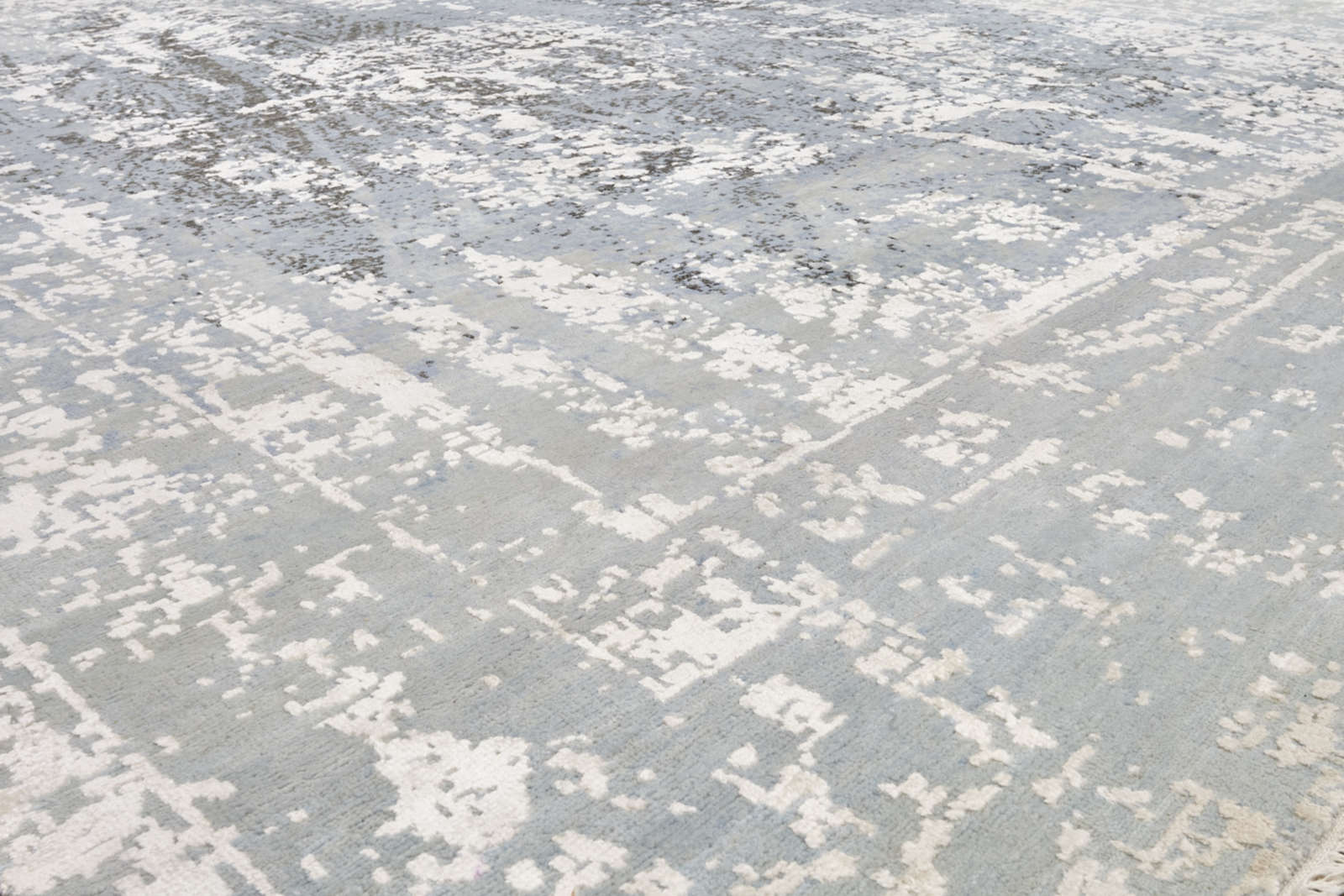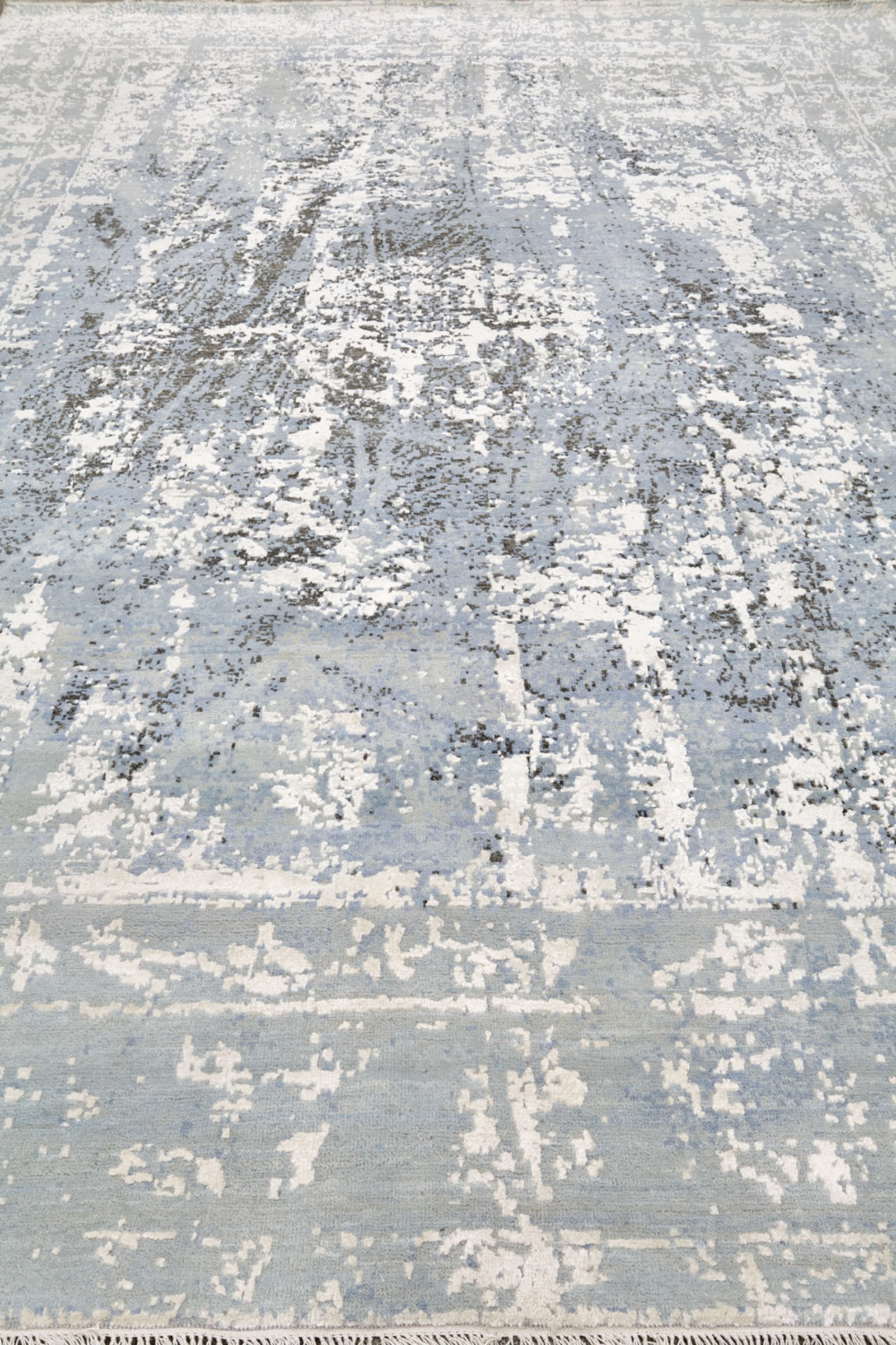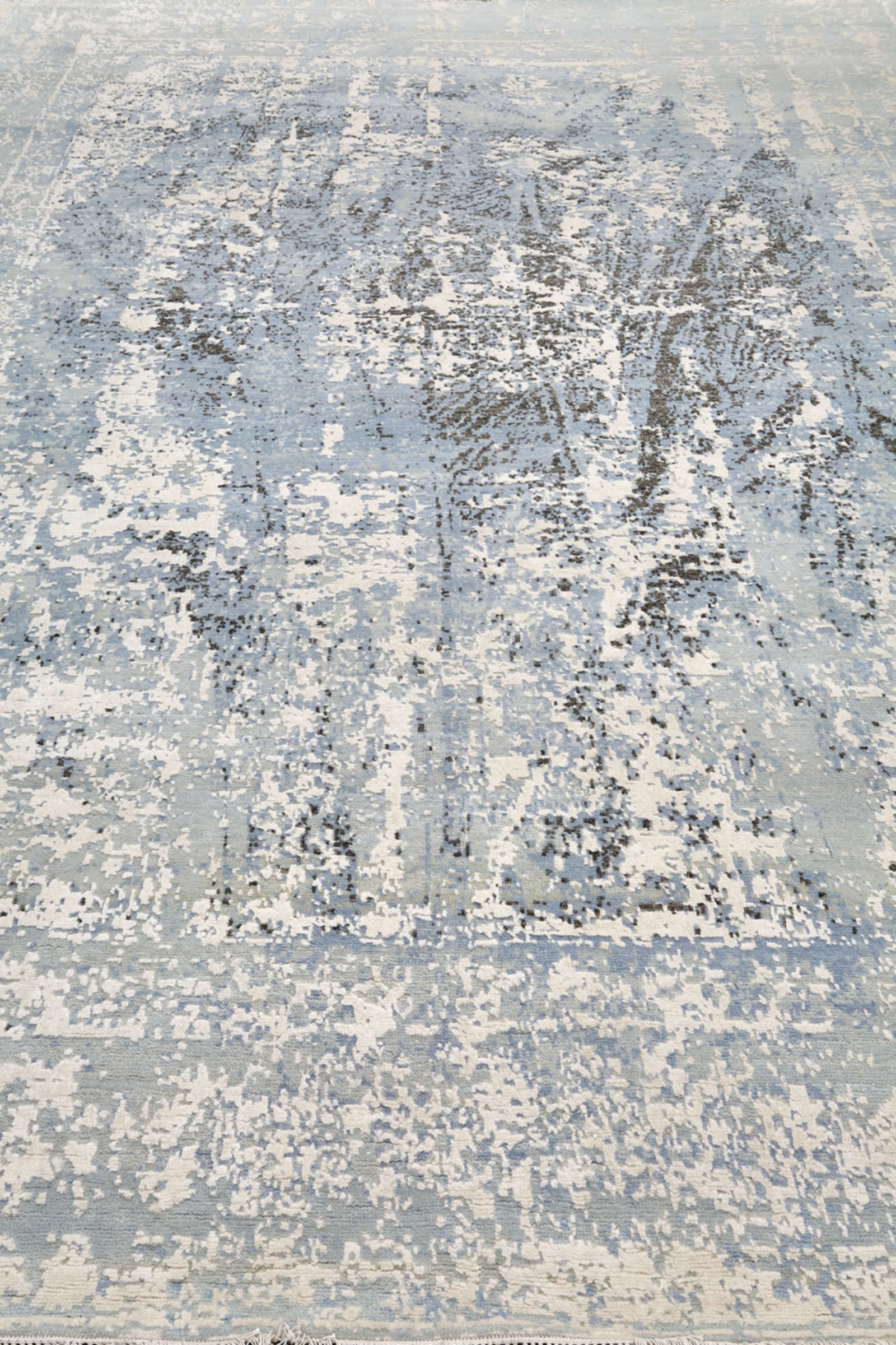 Ковёр бренда VISIONER из Индии играет светло-голубыми и белыми переливами. Его поверхность напоминает старое полотно с лёгкими потертостями. В центре угадывается абстрактный узор, создающий атмосферу свежести и тонкой поэзии.