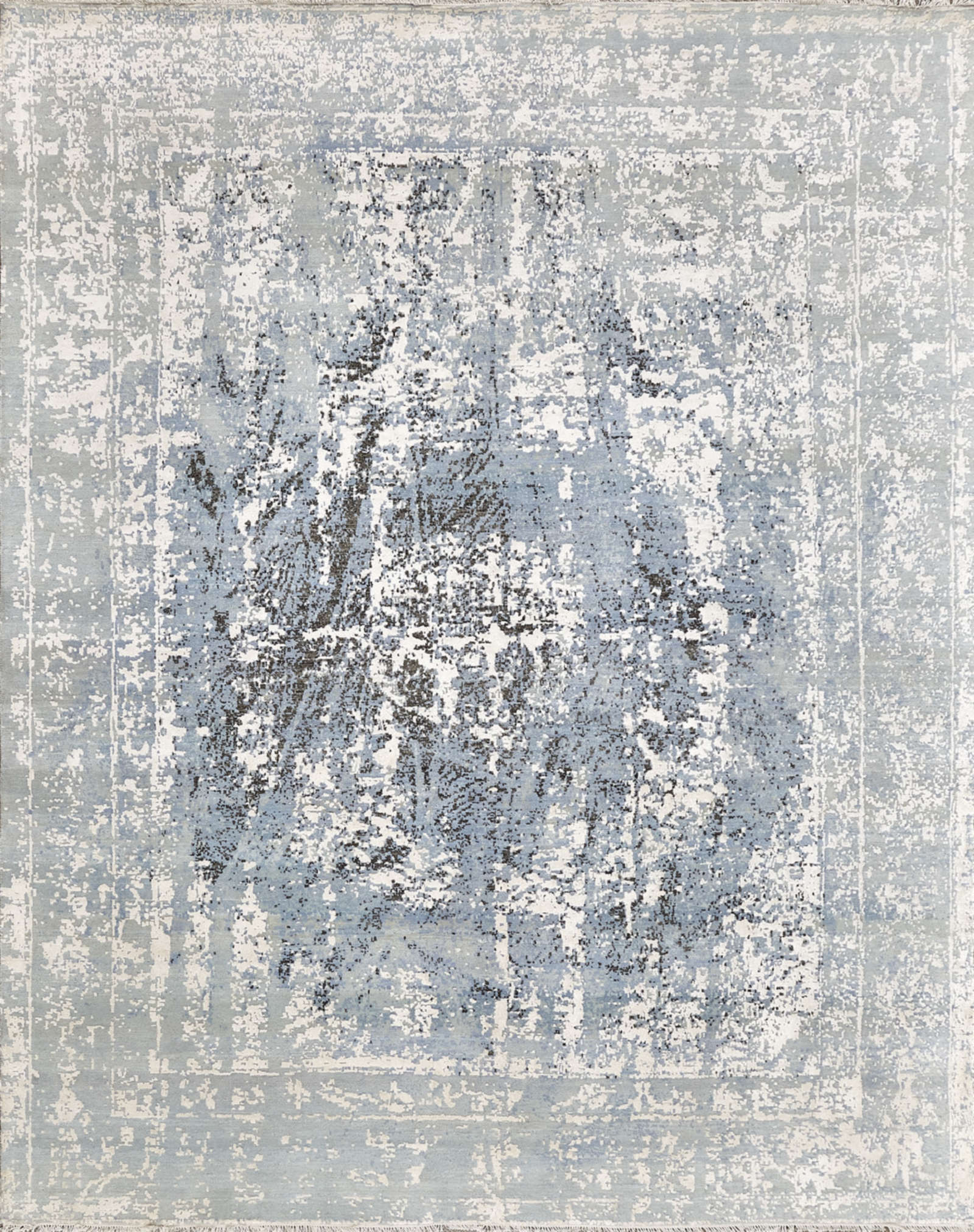 Этот ковёр, выполненный вручную индийскими мастерами, словно хранит дыхание времени. Светло-голубая поверхность украшена эффектом лёгкой патинированности, будто ткань веками хранила истории. В центре угадывается абстрактный рисунок, напоминающий силуэт ветвей или размытый акварельный штрих. Его цветовая палитра воздушна: белые, голубые и серые переливы создают ощущение прозрачности и лёгкости. Такой ковёр будет прекрасным решением для современных интерьеров — минимализм, скандинавский стиль, мягкая эклектика. Он особенно хорошо подчеркнёт просторные комнаты с большими окнами и светлым интерьером. Этот ковёр словно добавляет дому ощущение свежего ветра и утренней прохлады.