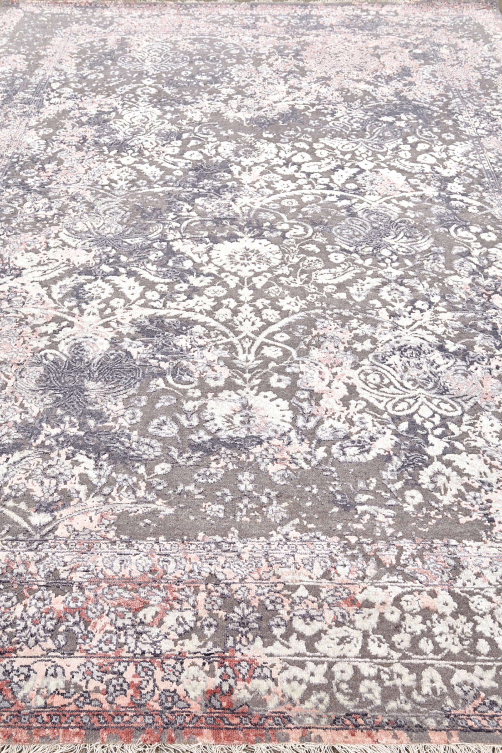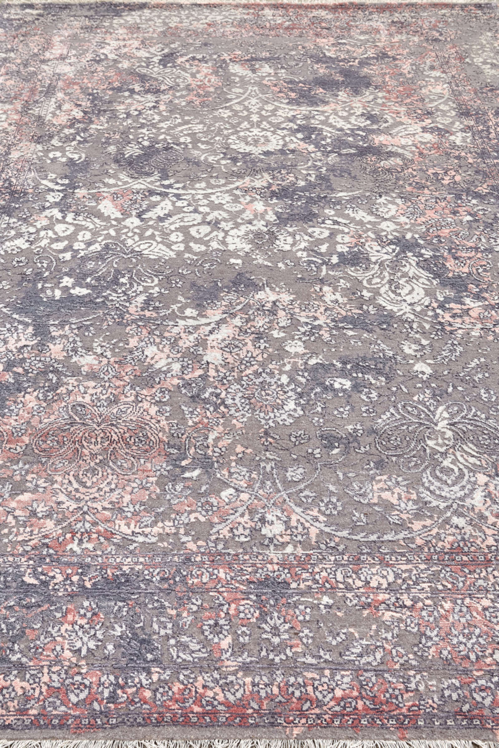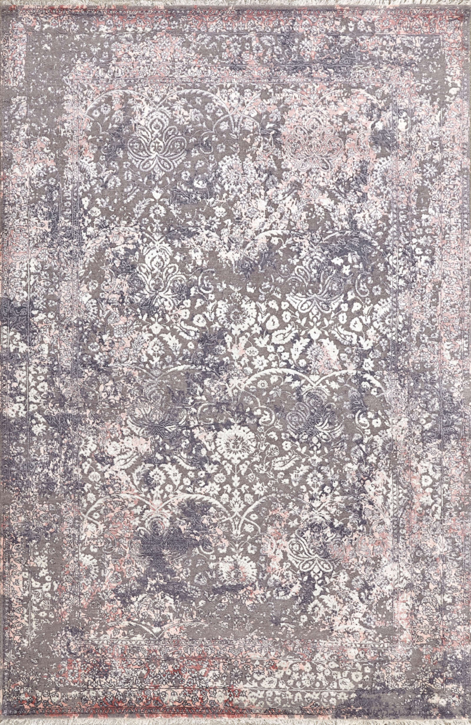 Индийский ковёр ручной работы украшен цветочным орнаментом, проступающим сквозь серо-лиловую патину. Его поверхность напоминает старинное полотно, которое сохранило красоту сквозь века. Такой ковёр придаёт интерьеру утончённость и шарм.