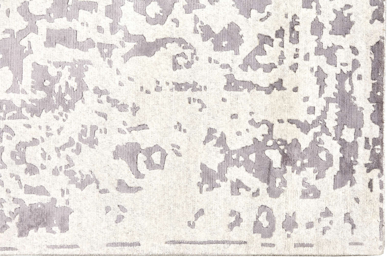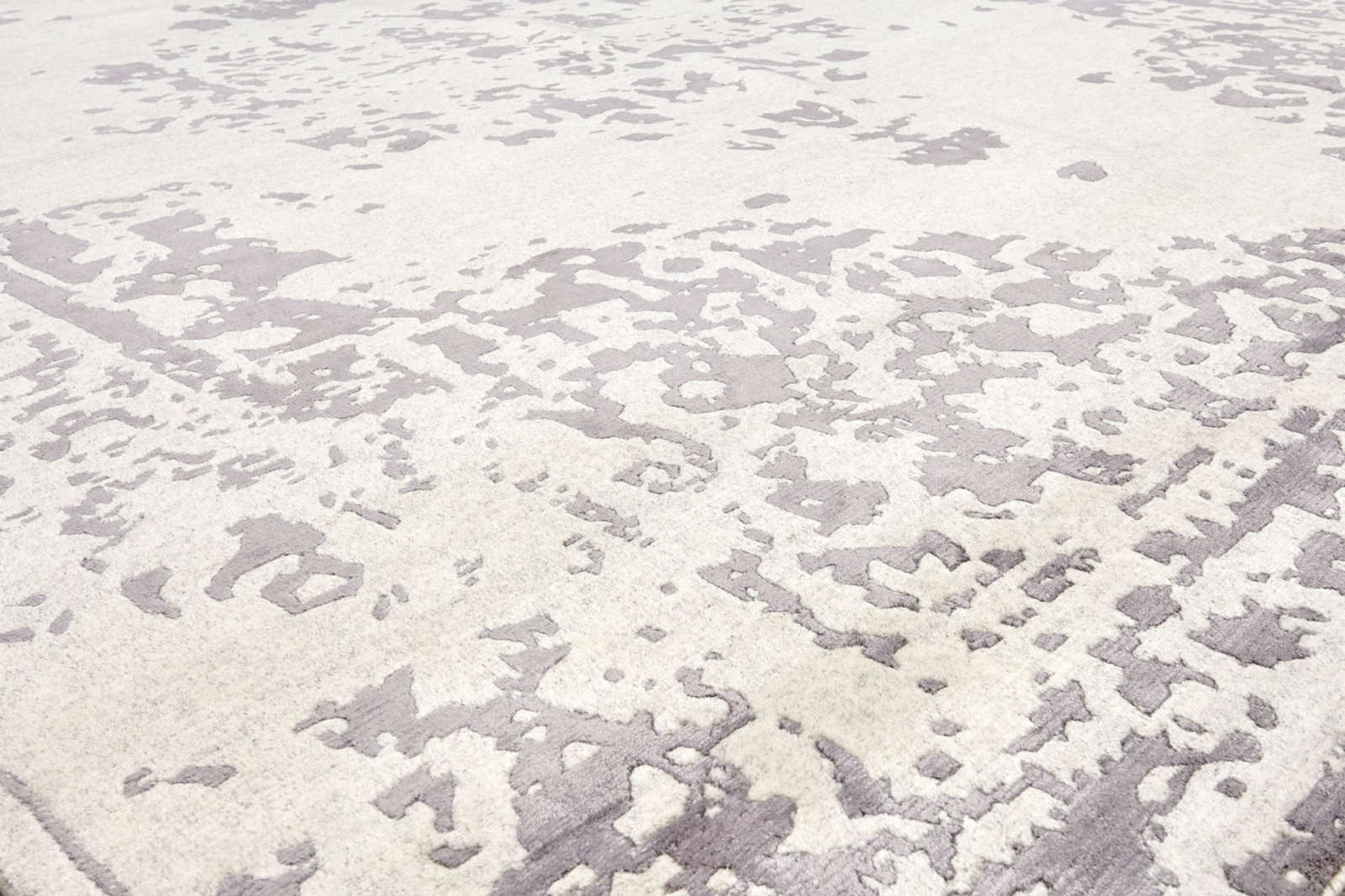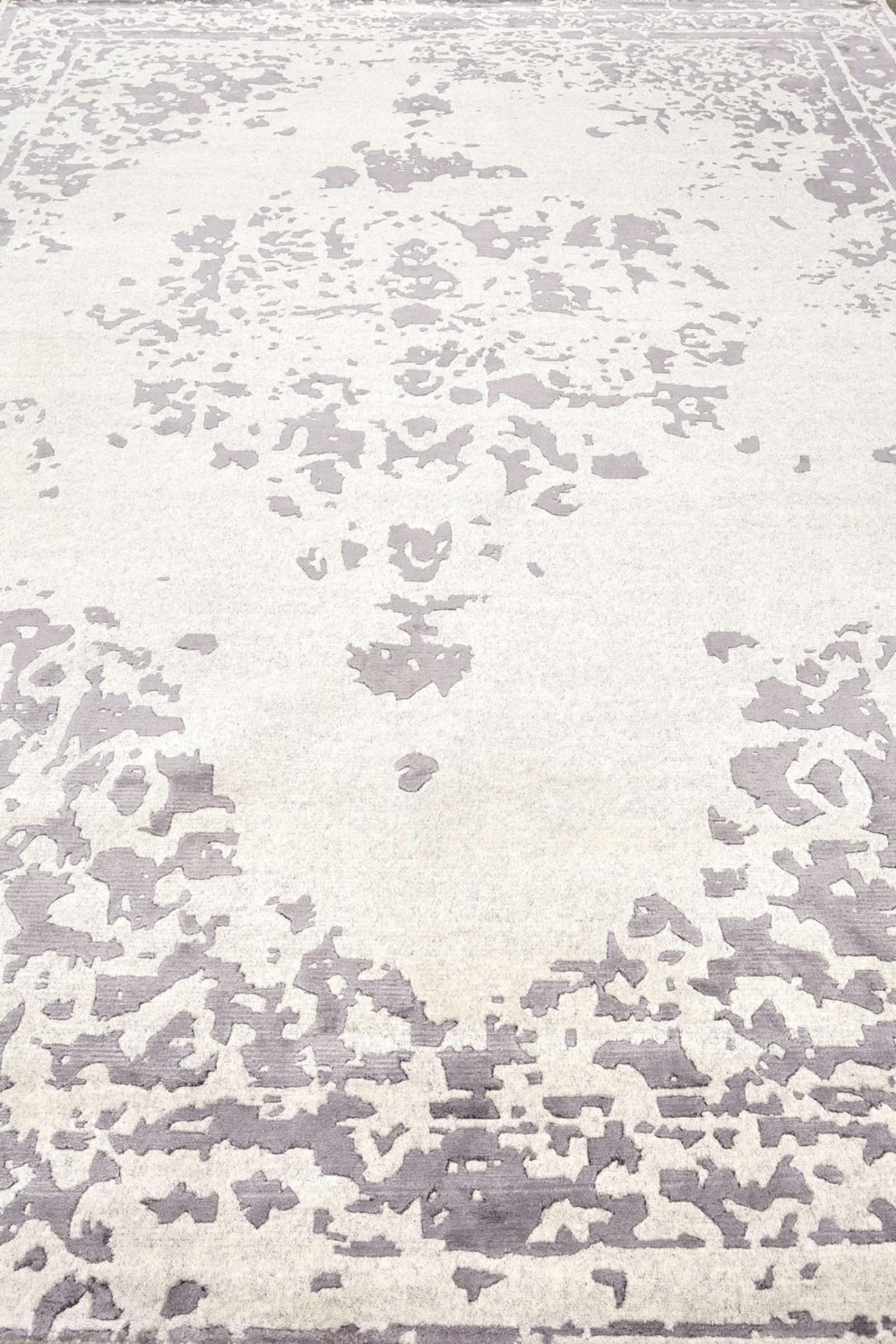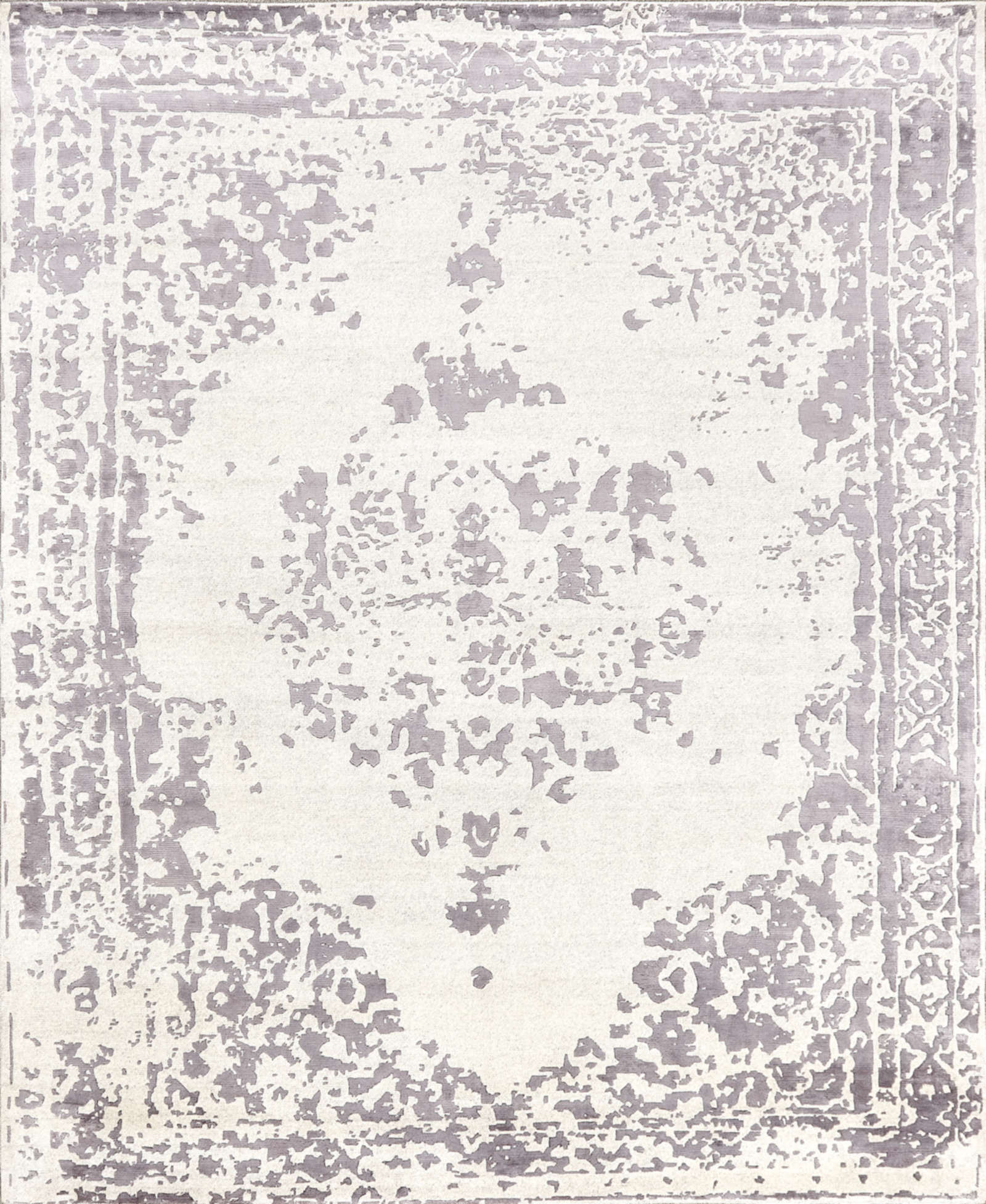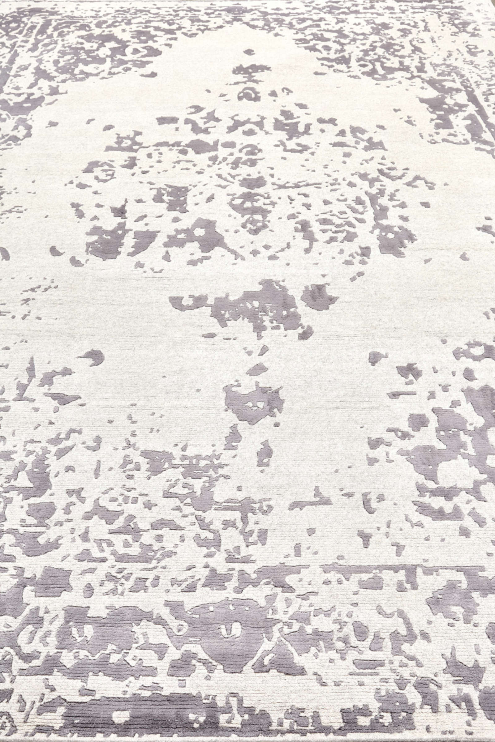 Ковёр напоминает старинное полотно, где узор сохранился лишь фрагментами. Светло-серый фон и «стёртый» медальон создают атмосферу благородной старины. Такой ковёр наполняет интерьер глубиной и историей.