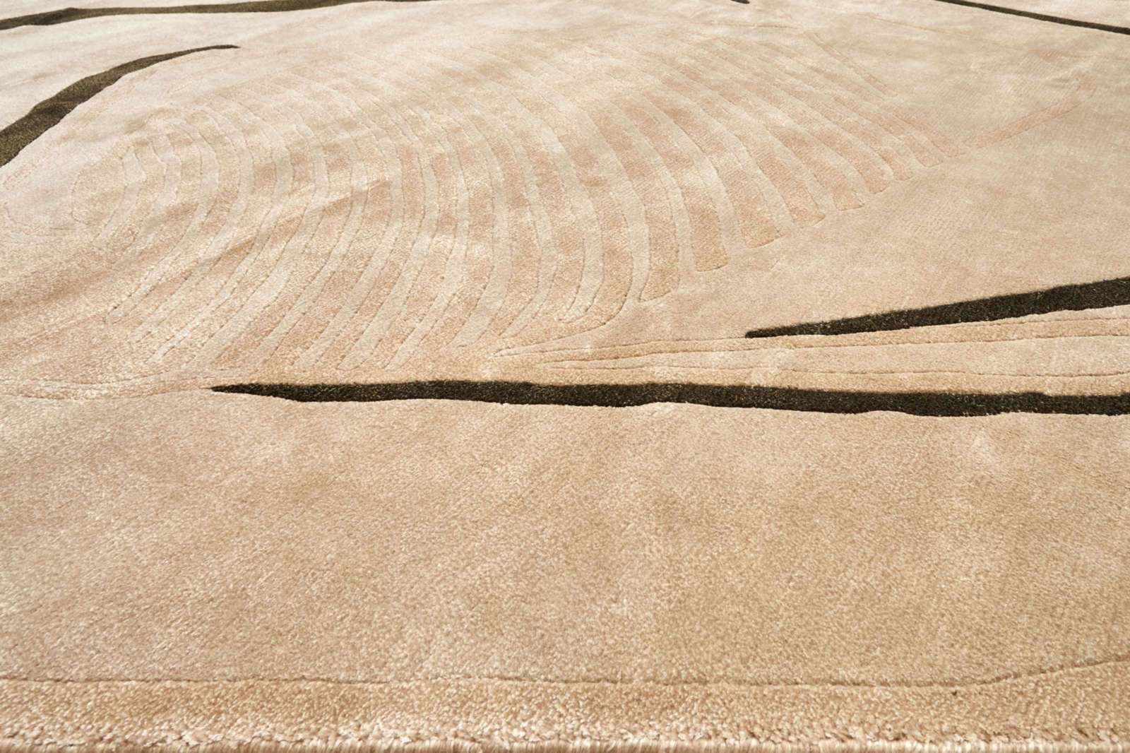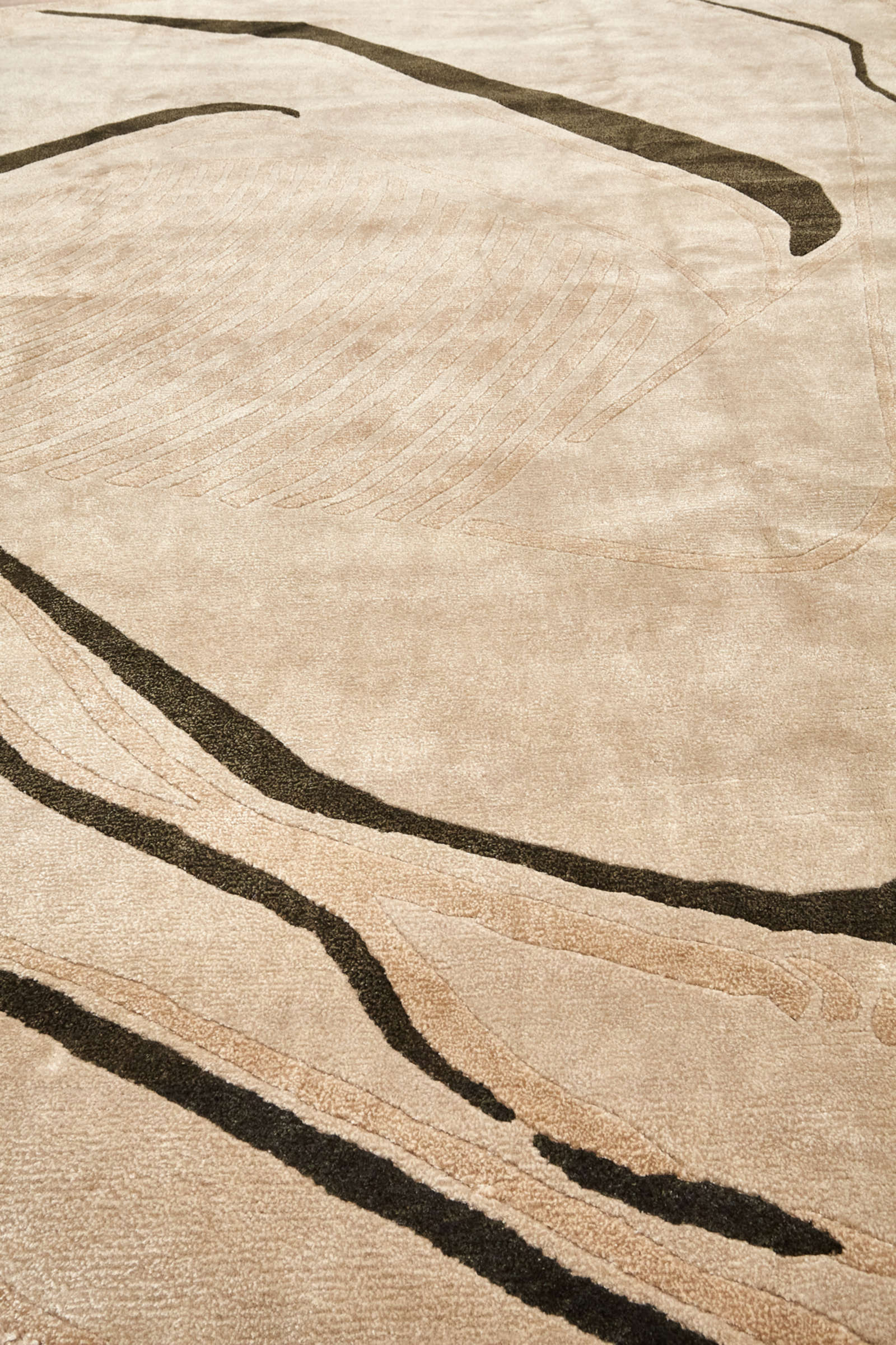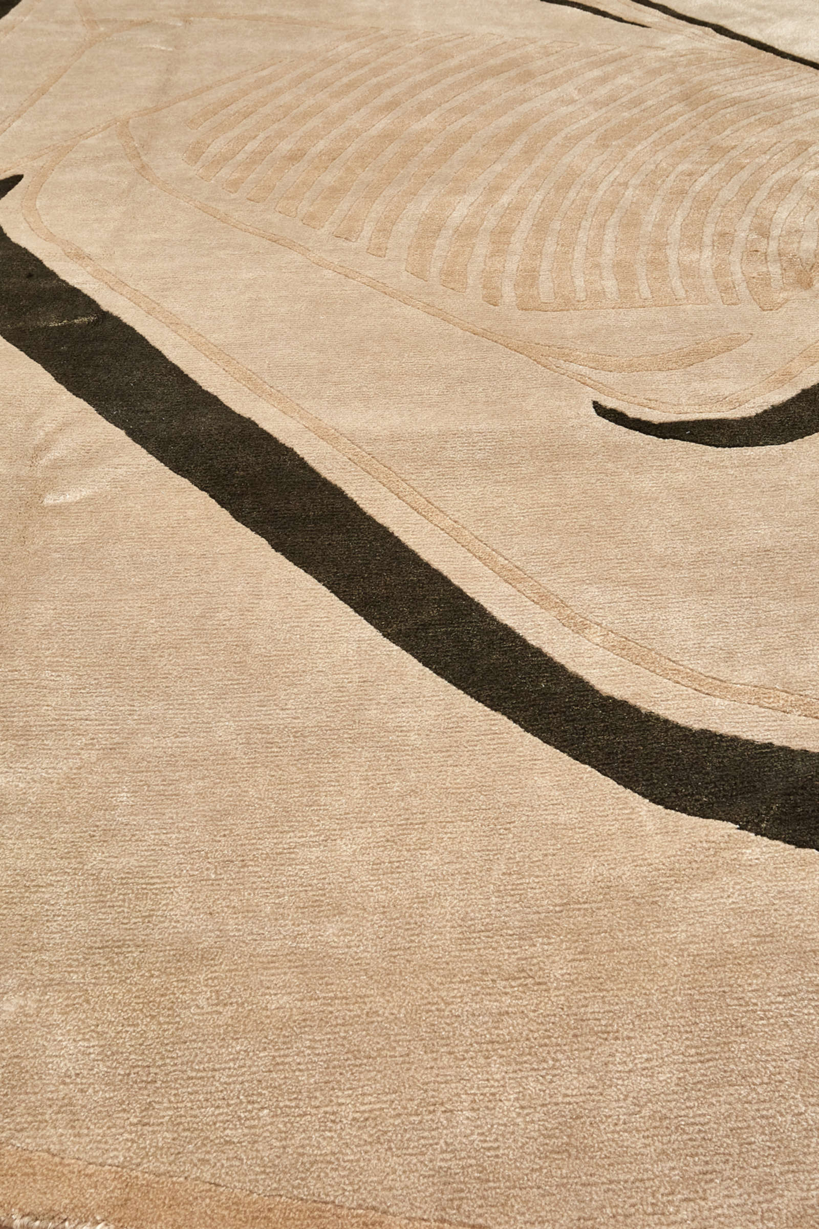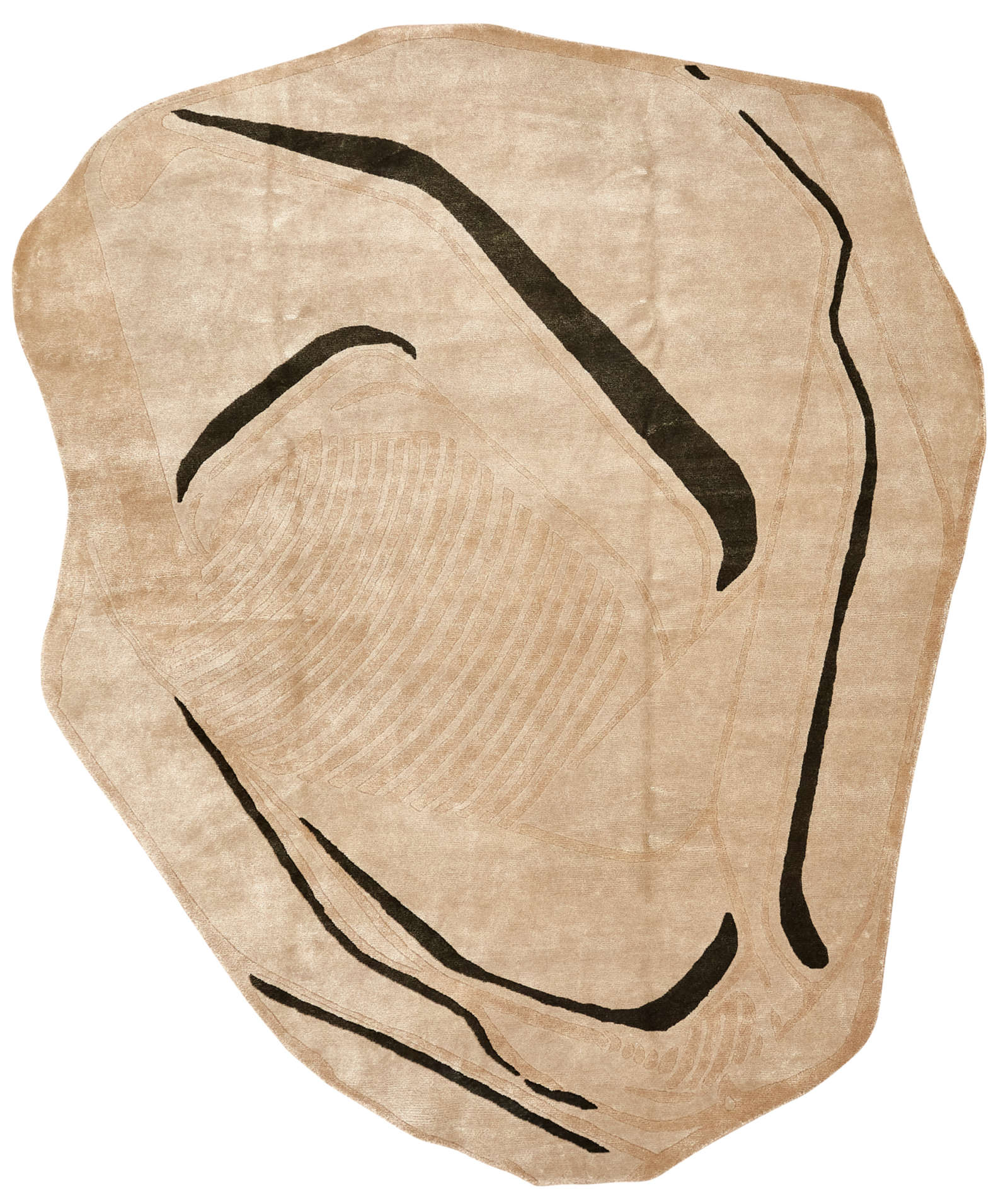 Этот ковёр напоминает современную скульптуру, воплощённую в текстиле. Его свободная асимметричная форма и черные линии, будто нарисованные кистью тушью, создают ощущение художественной импровизации. В нём нет строгой симметрии — напротив, именно живое движение линий придаёт рисунку энергию и глубину. Такое решение станет выразительным акцентом в интерьере. В минимализме ковёр добавит пластики и художественности, в пространстве с этническими элементами подчеркнёт связь с природой и ручным искусством, в современном стиле выступит как арт-объект, формирующий настроение. Он особенно уместен в гостиных с открытым пространством, где способен задать тон всей композиции, или в спальне, где мягкость фактуры соединится с философской простотой рисунка. Это ковёр для тех, кто ценит уникальность, эстетику современного искусства и гармонию свободной формы.