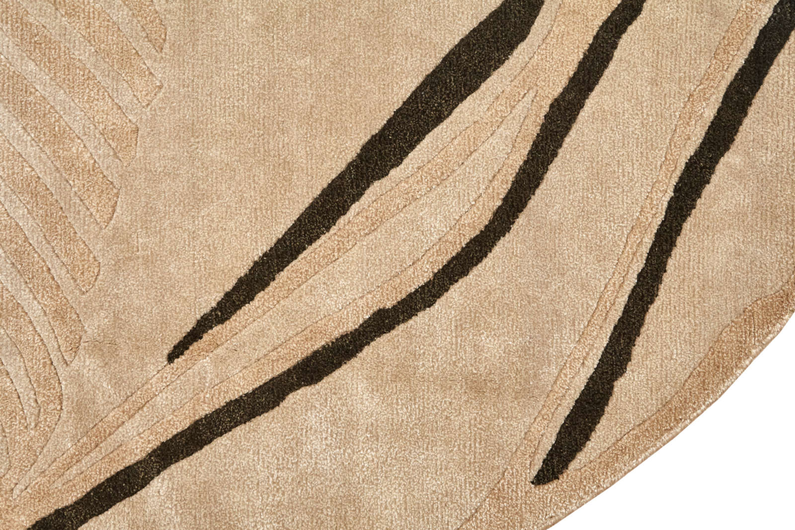Ковёр необычной формы с абстрактными чёрными линиями напоминает современную графику. Его свободные очертания и мягкая фактура создают ощущение динамики и лёгкости, превращая интерьер в пространство искусства и индивидуальности.