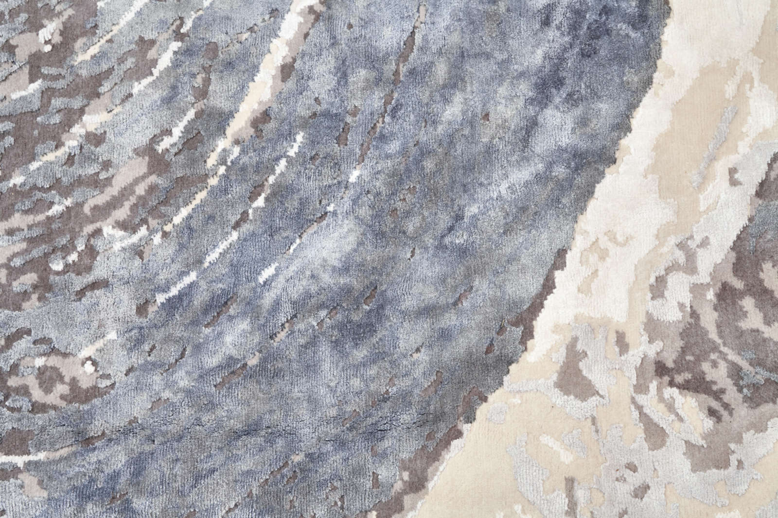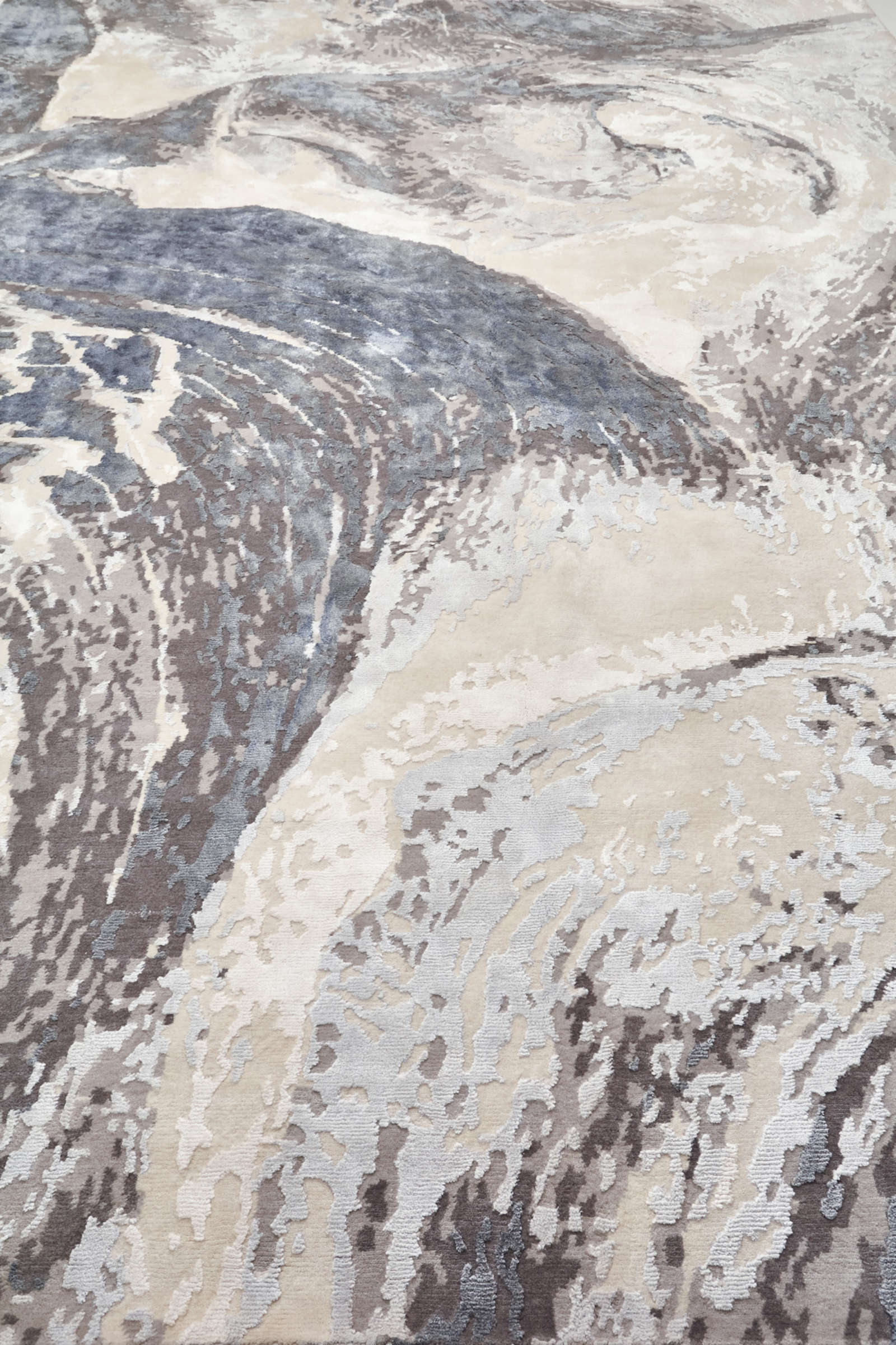 Ковёр похож на поток воды, бегущий по каменной поверхности. Серые и молочные линии переплетаются, создавая ощущение движения и живой стихии. Такой акцент в интерьере добавляет энергии и напоминает о близости природы.