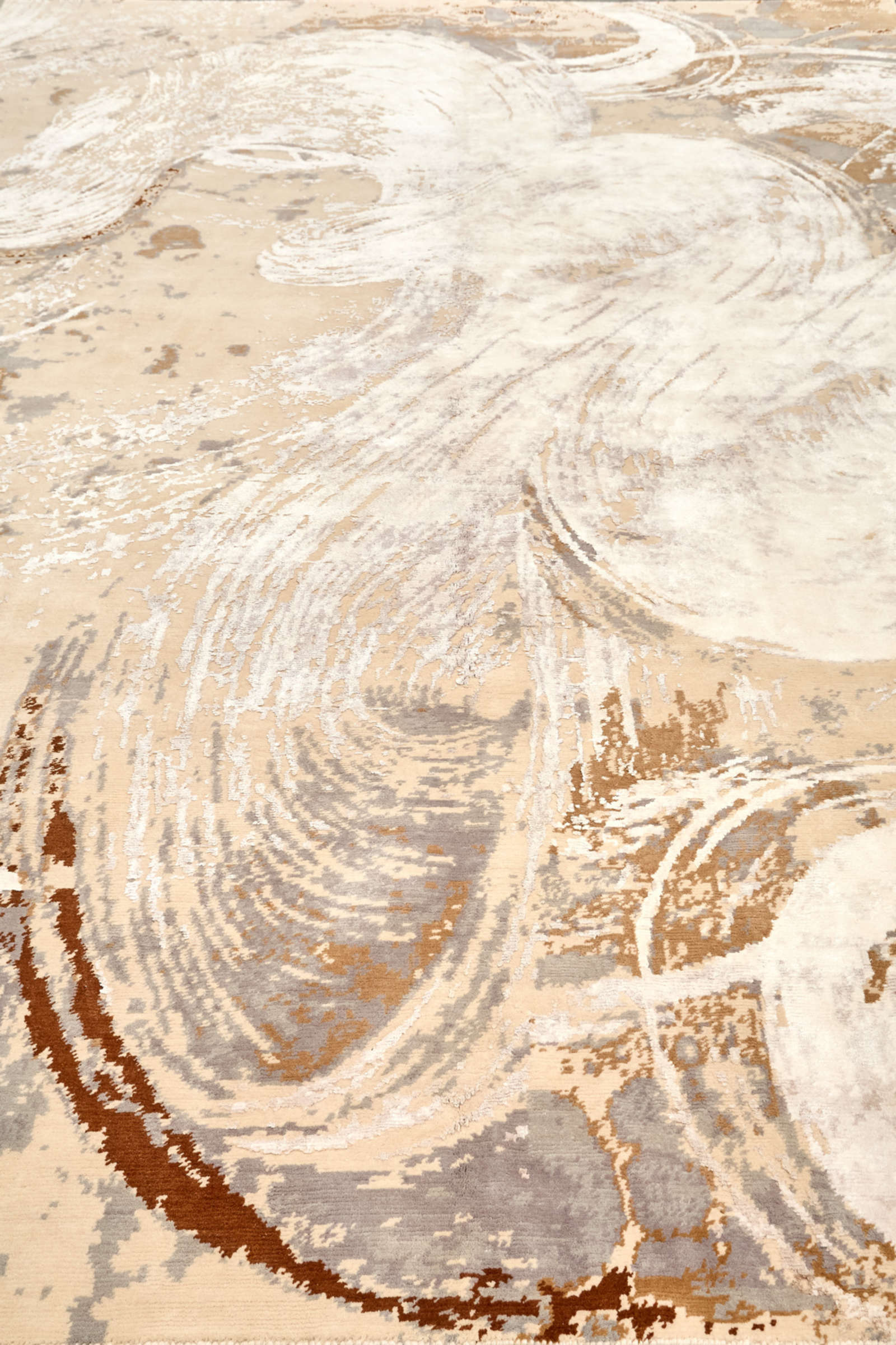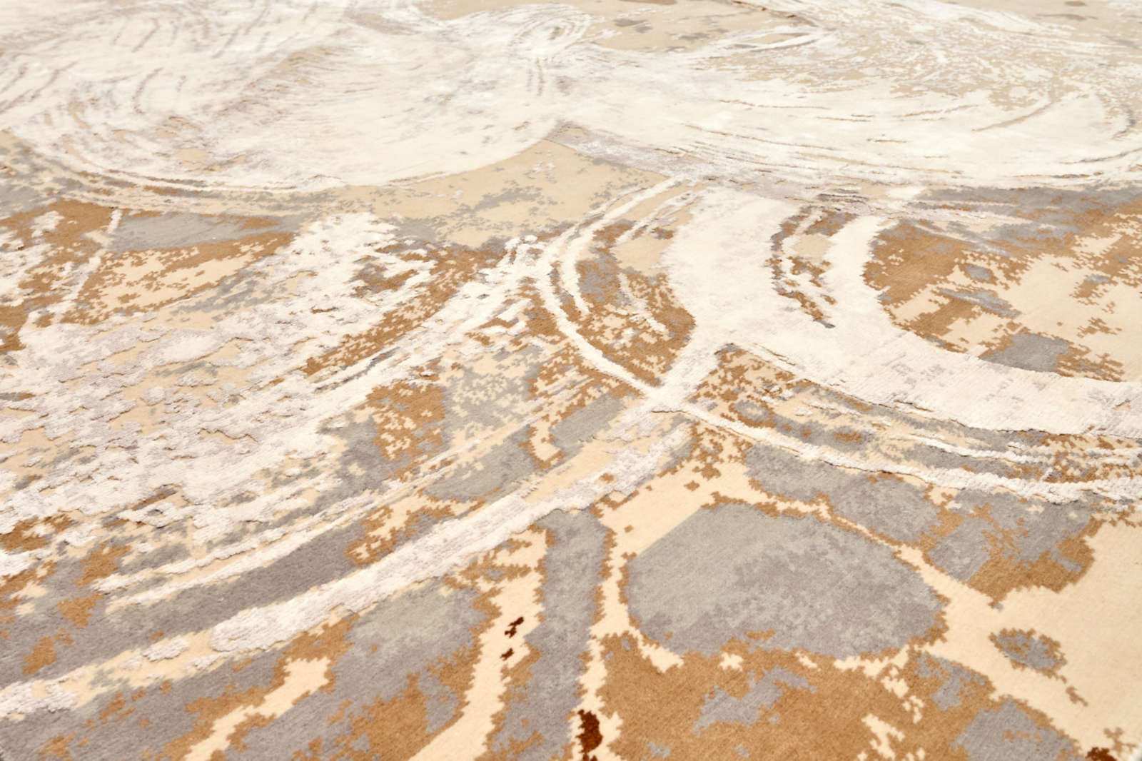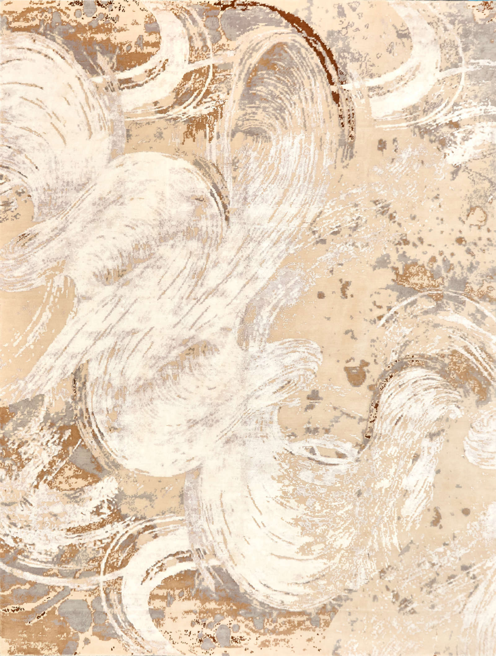 Этот ковёр выглядит как живописное полотно: на бежево-кремовом основании художник провёл энергичные белые мазки, будто фиксируя вихрь воздуха. Контрастные участки коричневого добавляют фактуру и глубину, создавая игру света и тени. Он словно хранит в себе момент движения, когда всё вокруг замирает, и только ветер рисует узоры. В интерьере такой ковёр становится акцентом, оживляет пространство, создаёт настроение свободы и лёгкой экспрессии. Он уместен в гостиных с большим количеством света, прекрасно дополнит современные минималистичные решения и добавит тепла классике.