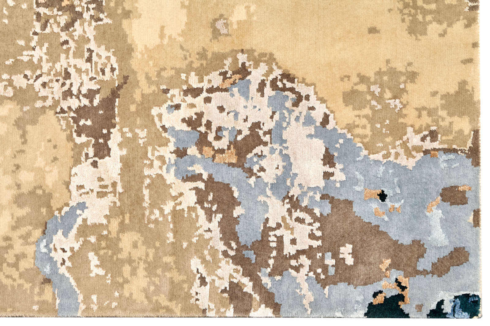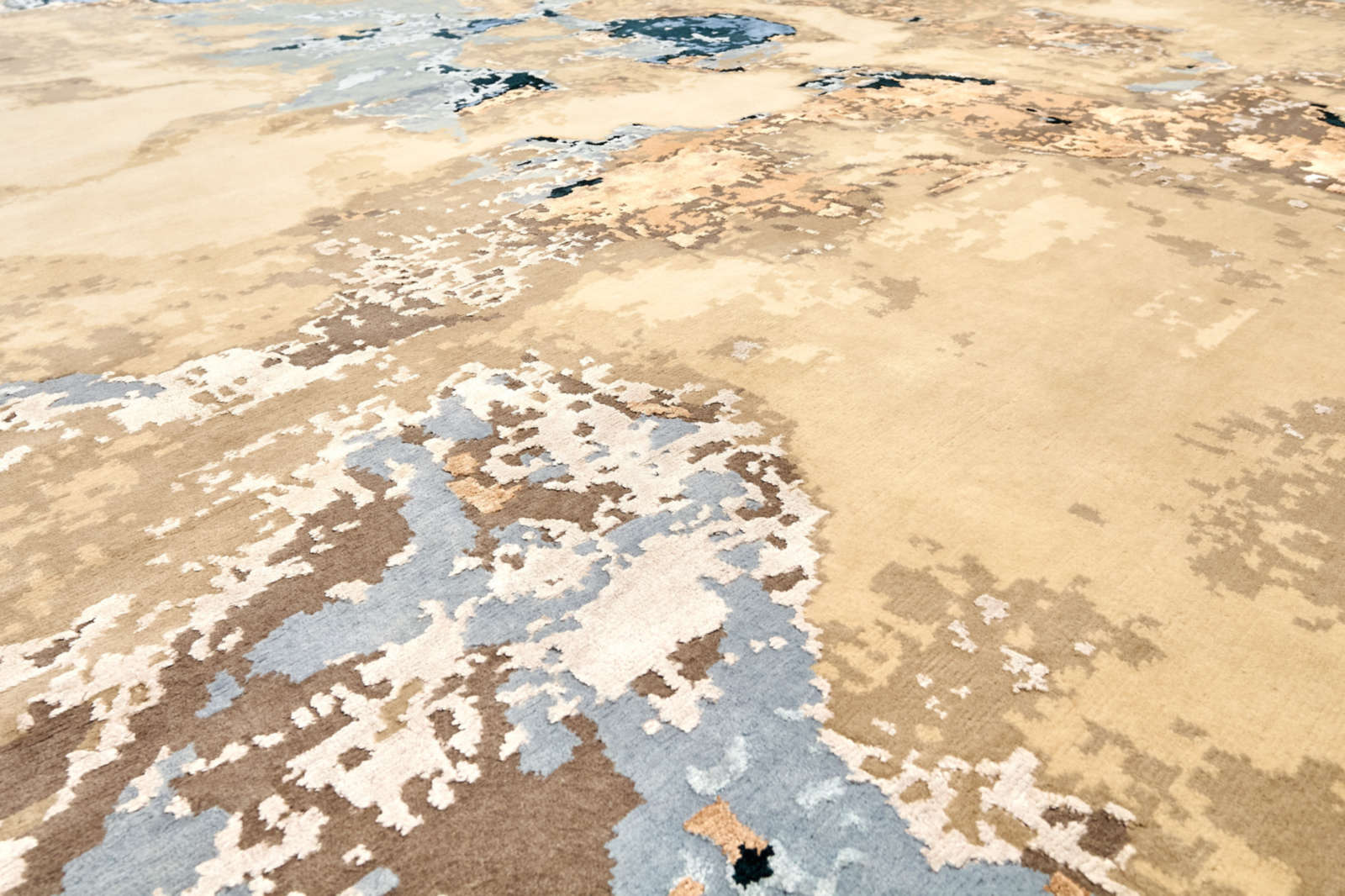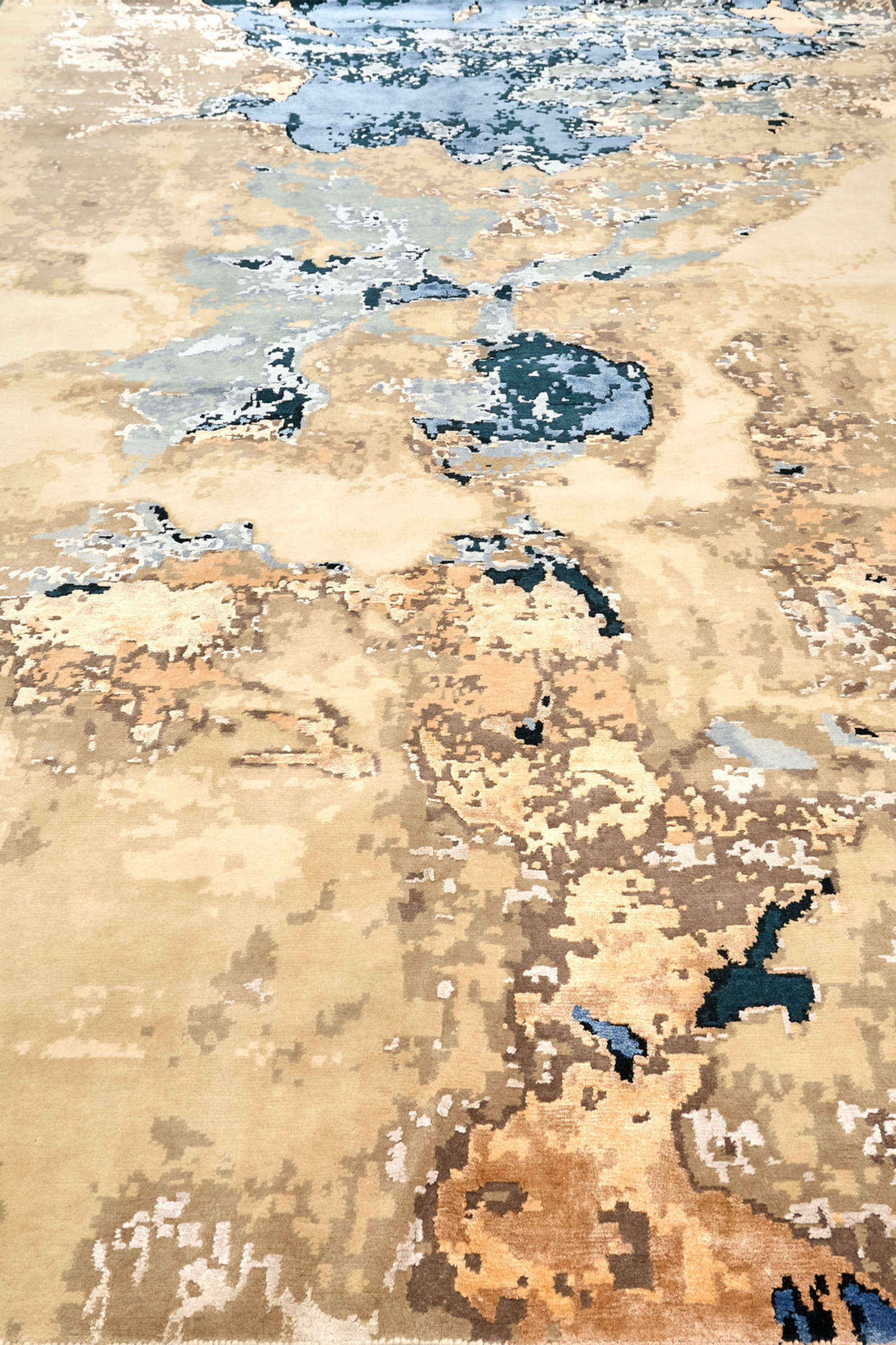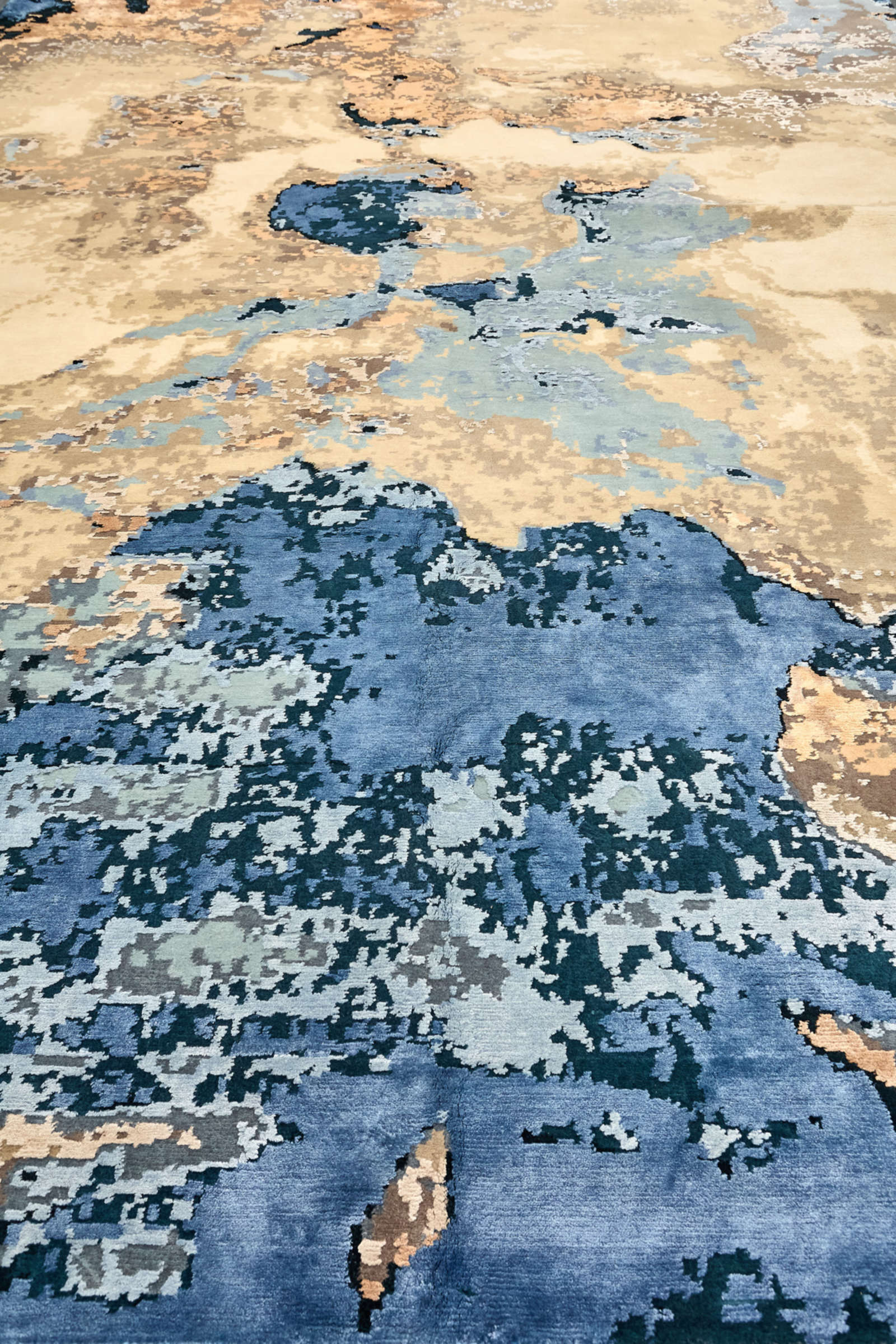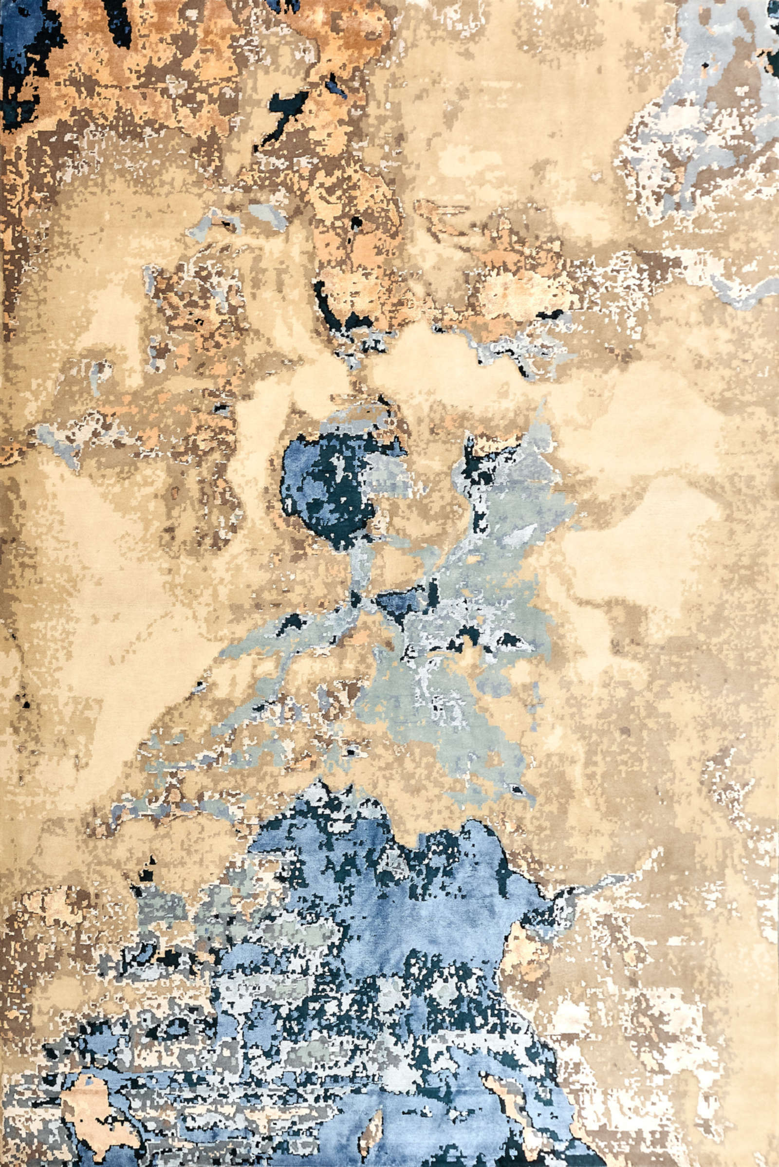 В этом ковре нет чётких форм — только свободные переливы, которые напоминают о движении стихий. Взгляд улавливает очертания то ли океана с его сменой приливов и отливов, то ли далёких ландшафтов, увиденных как бы сверху. Каждый раз он открывается по-разному, словно бесконечно переписывает свою собственную историю. В интерьере ковёр работает как художественный акцент, внося ощущение свежести и широты пространства. В минималистичных решениях он добавляет глубину и живость, в классических — лёгкий оттенок современности, в эклектичных — объединяет разнородные элементы. Он легко создаёт настроение: в гостиной — становится центром спокойной беседы, в кабинете — символизирует свободу мысли, в спальне — дарит чувство уюта и умиротворения. Это ковёр, который не диктует правила, а лишь открывает пространство для воображения и создаёт атмосферу, где природа и искусство звучат в унисон.