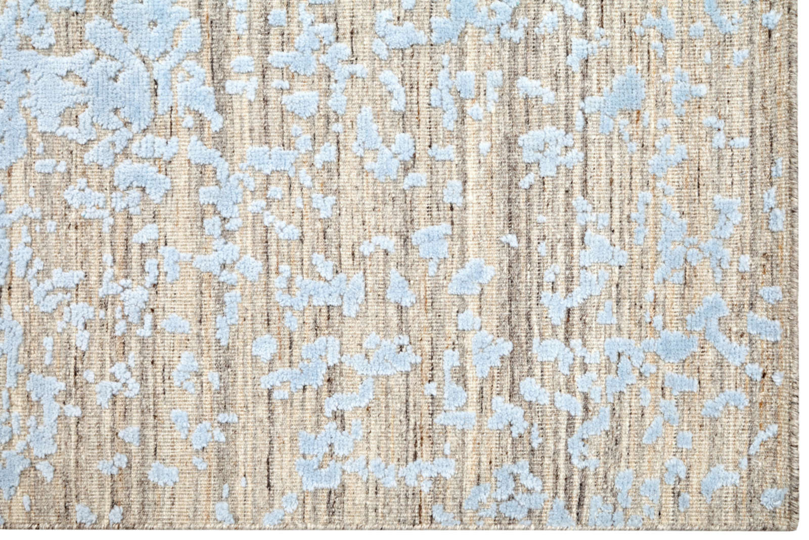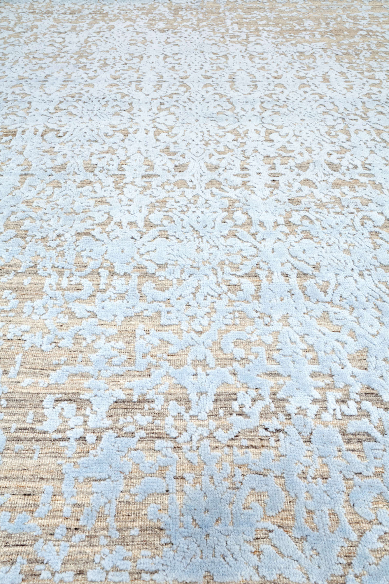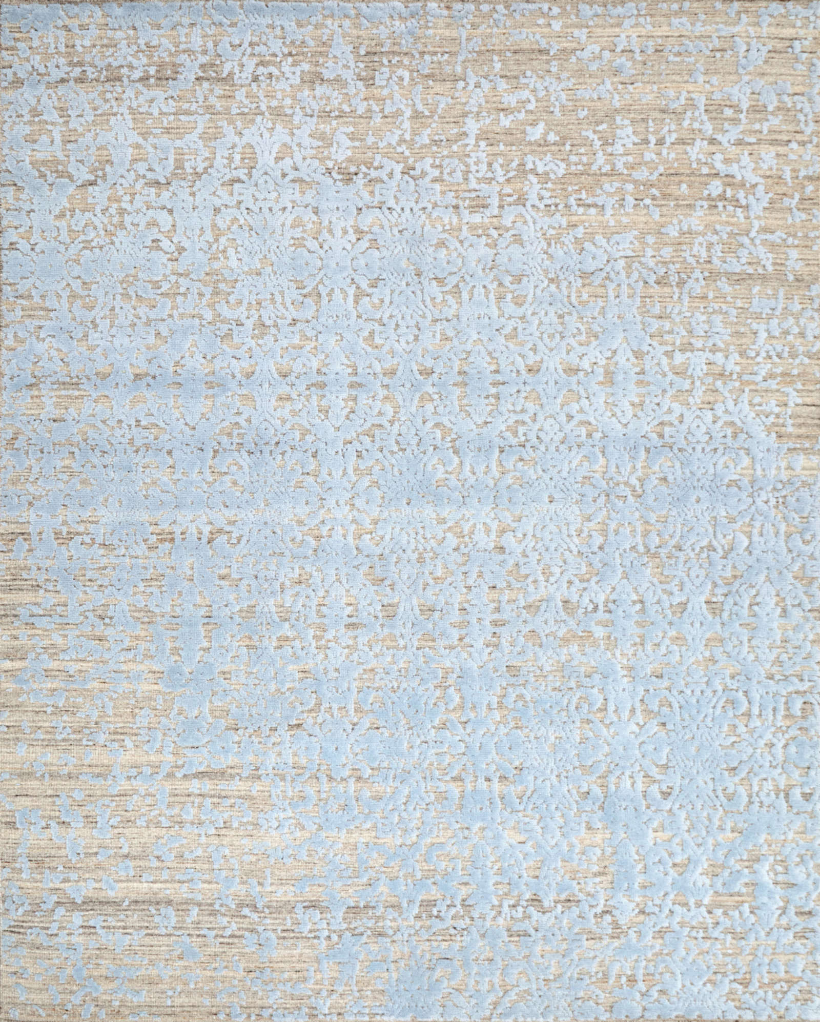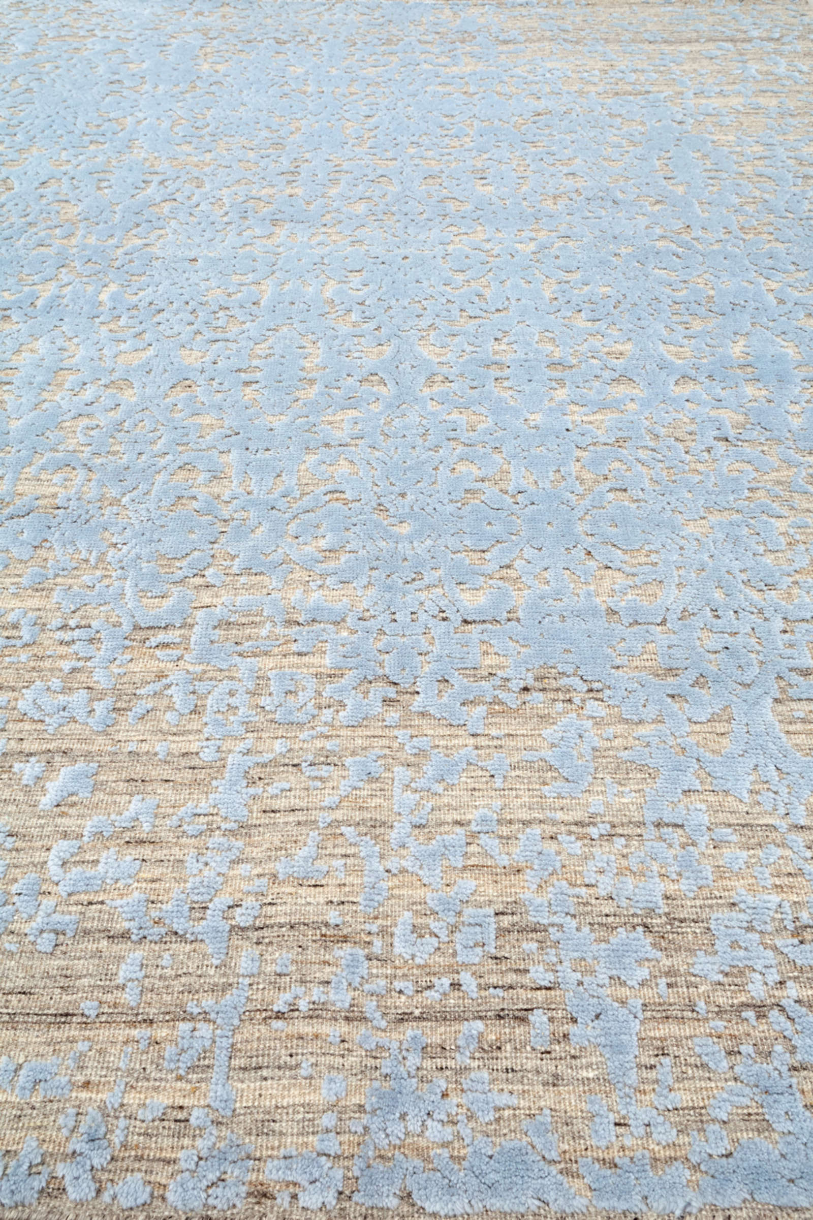 Индийский ковёр ручной работы украшен размытым орнаментом в голубых тонах. Его рисунок будто растворяется в воздухе, создавая лёгкость и ощущение прозрачности. Такой ковёр наполняет интерьер светом и гармонией.