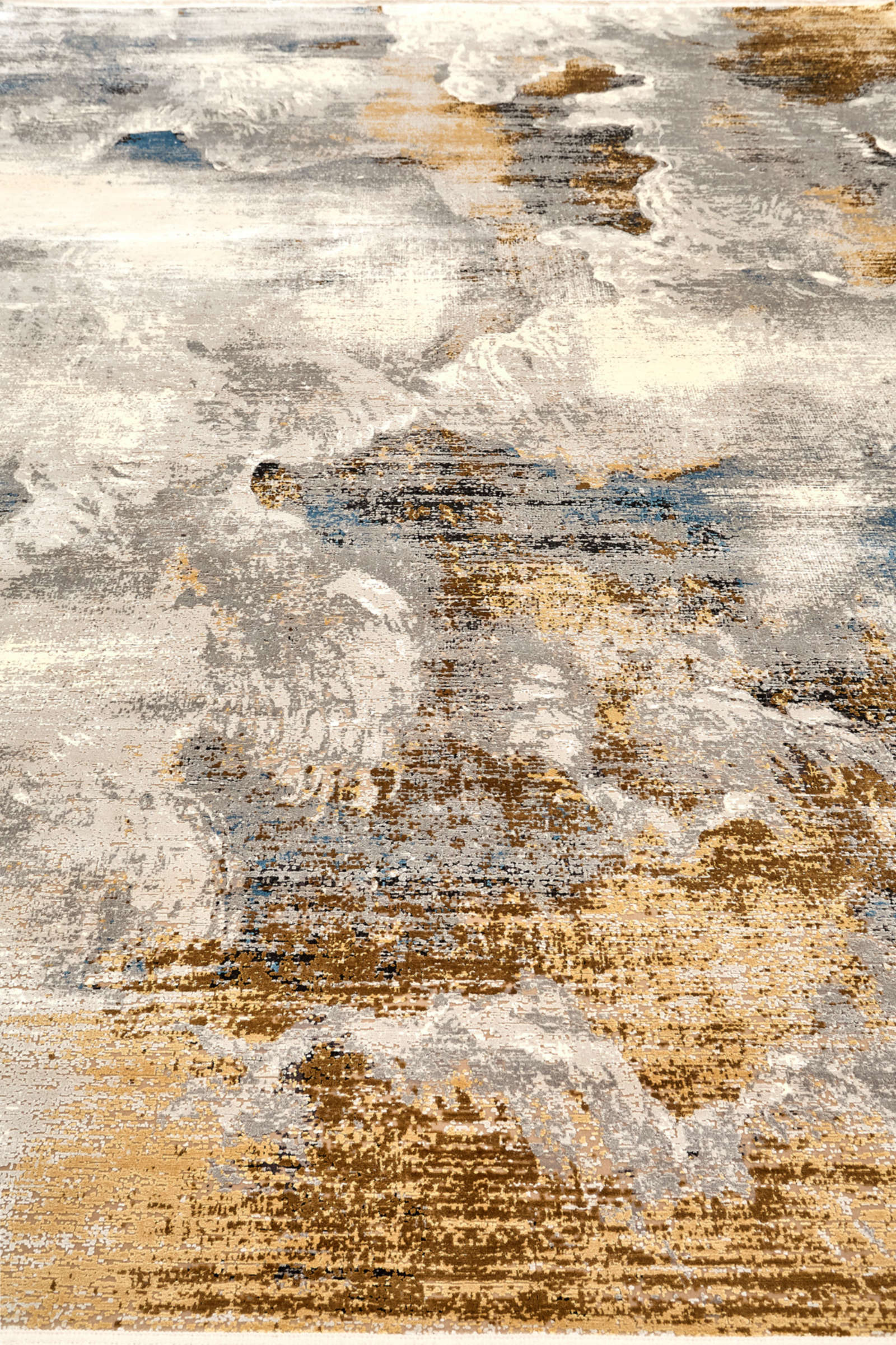 Живописный дизайн в мягкой цветовой гамме. Поверхность переливается подобно солнечным бликам на воде. Сочетание песочных, серых и голубых оттенков создаёт ощущение свежести, а золотистые акценты добавляют тепла. Абстрактный рисунок вызывает природные ассоциации — с ветром, морем, облаками. Такой ковёр становится гармоничным дополнением современного интерьера, где важны свет и пространство. В гостиной он добавляет мягкого блеска, в спальне — создаёт атмосферу уюта, в кабинете — способствует балансу. Этот дизайн не просто украшает помещение, а формирует его настроение.