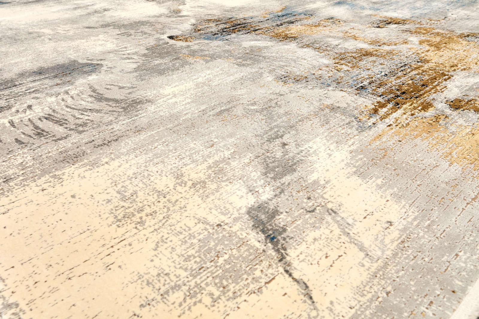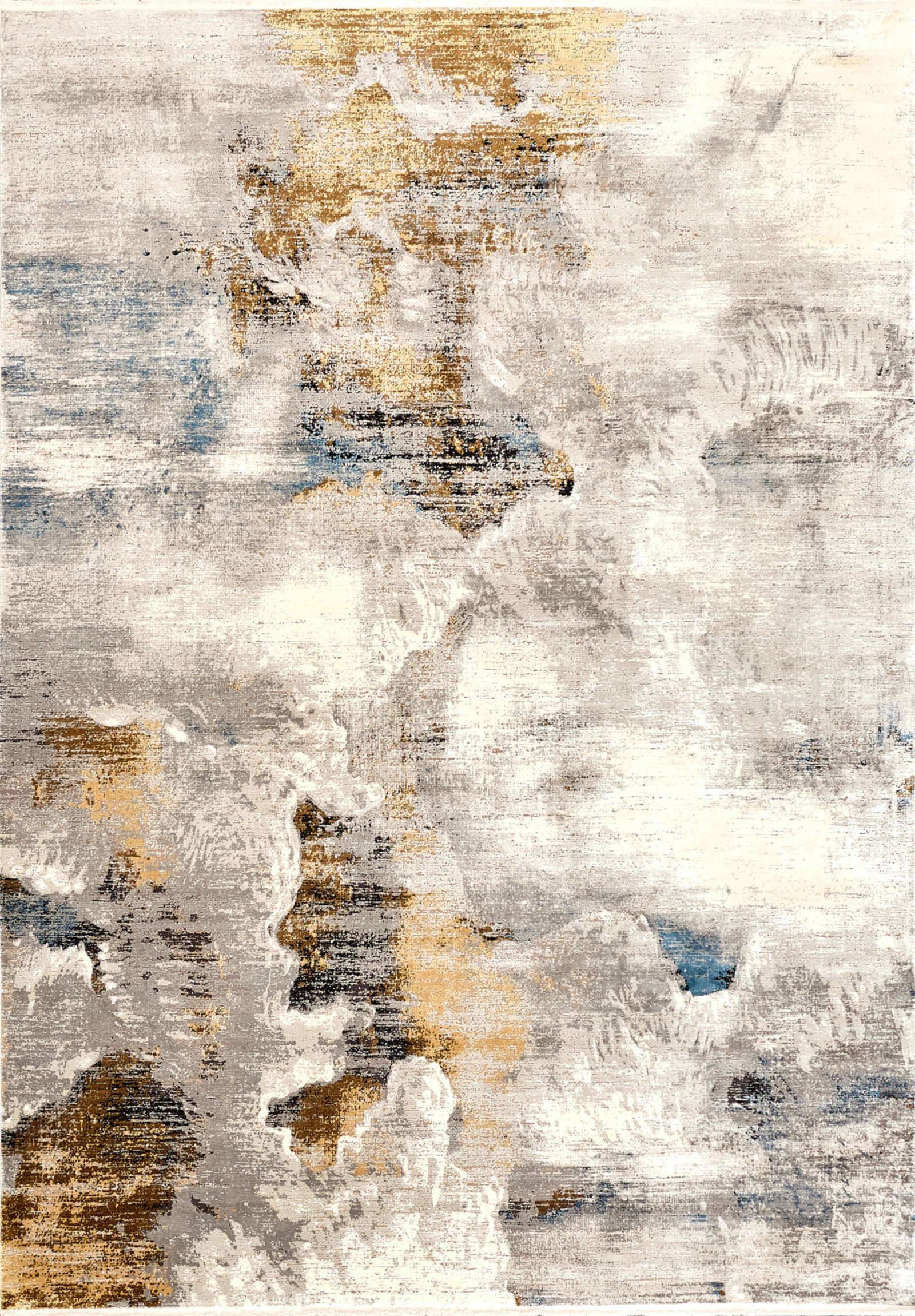 Ковёр с живописным рисунком, напоминающим игру света на воде. Плавные переходы между серыми, бежевыми, голубыми и золотистыми тонами создают ощущение свежести и спокойствия. Идеален для светлых просторных интерьеров.