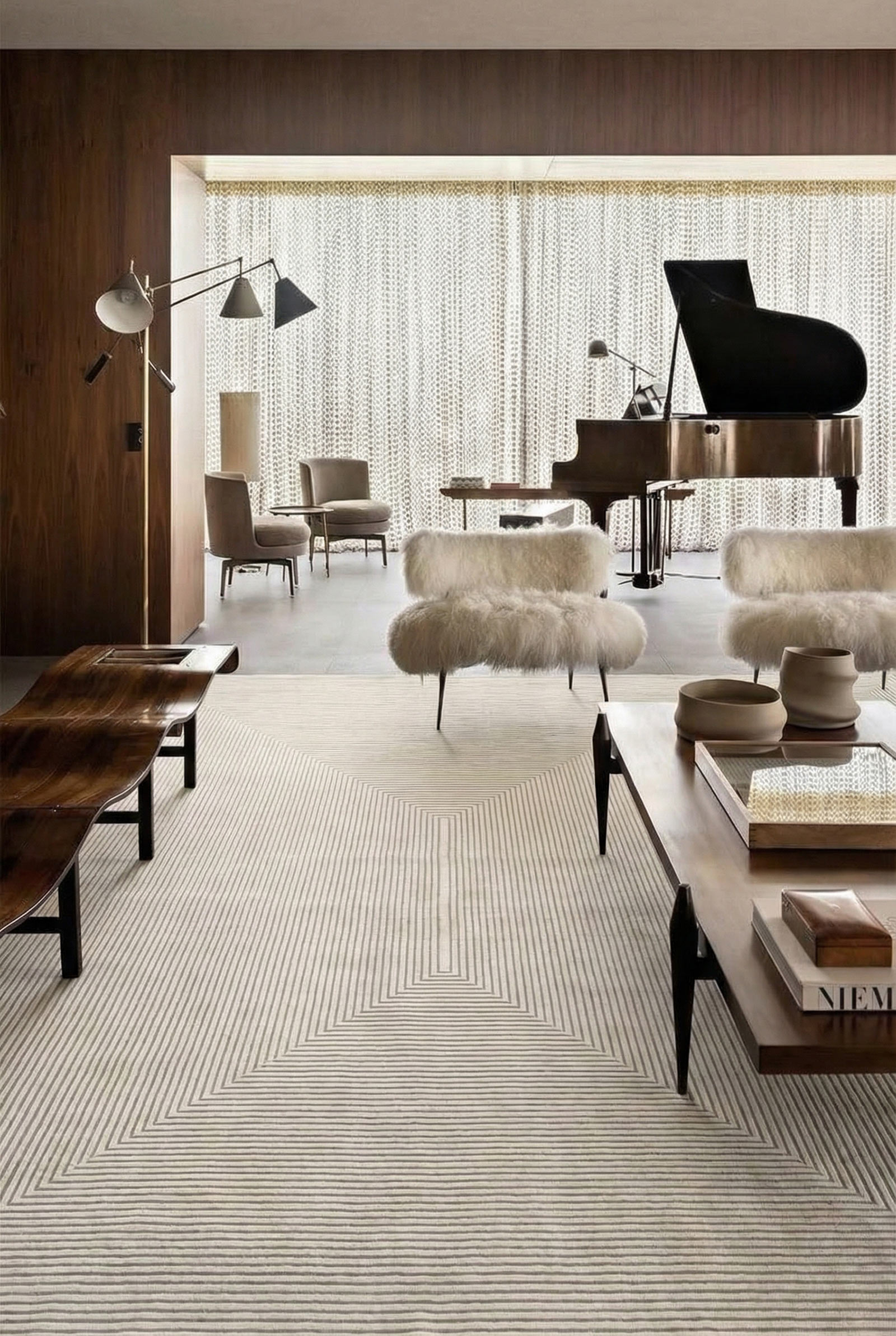 Дизайнерский ковёр с благородным серым оттенком и тонкой геометрией. Его бархатистая поверхность придаёт интерьеру спокойствие и утончённость. Идеальный абстрактный ковёр для современных пространств.
