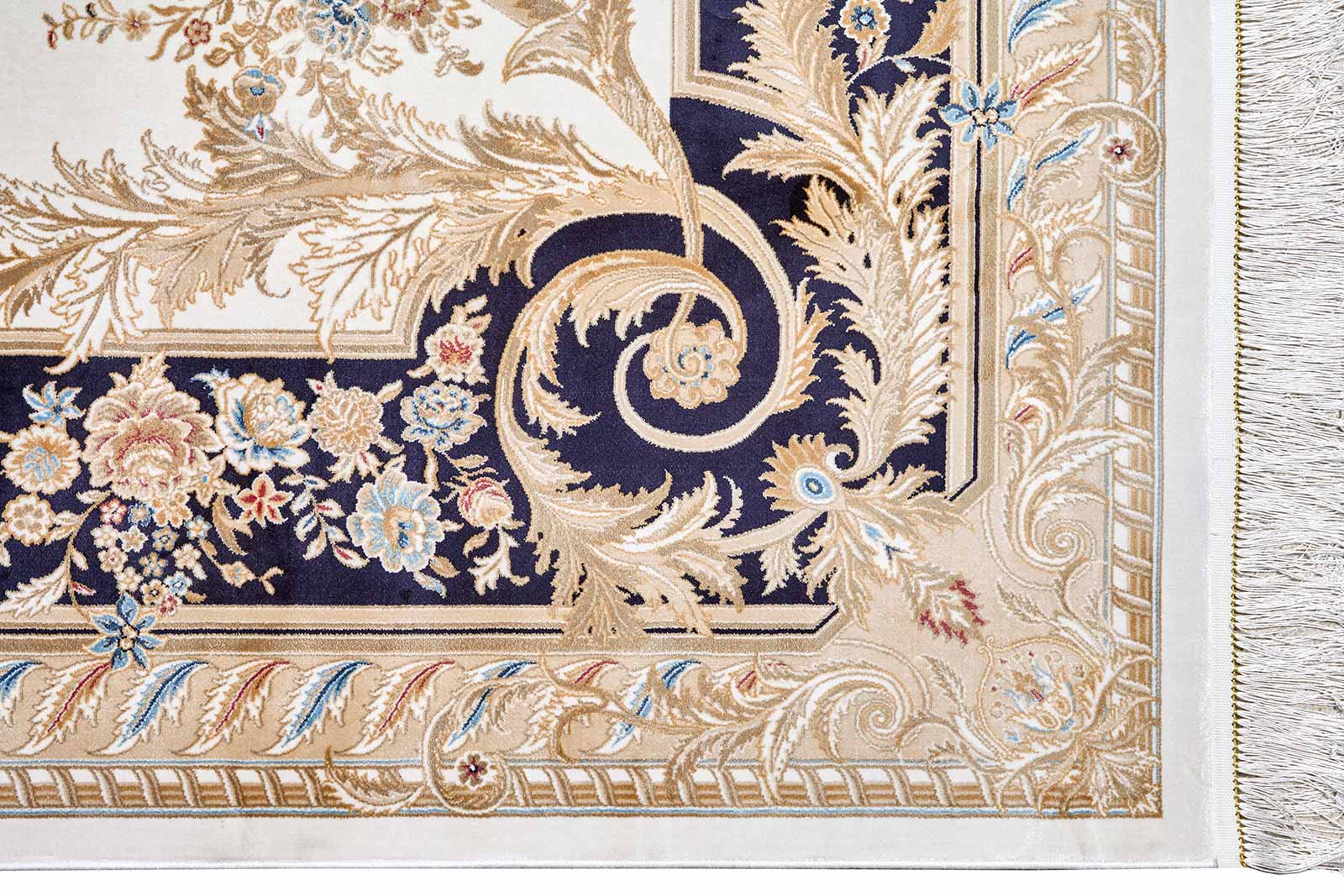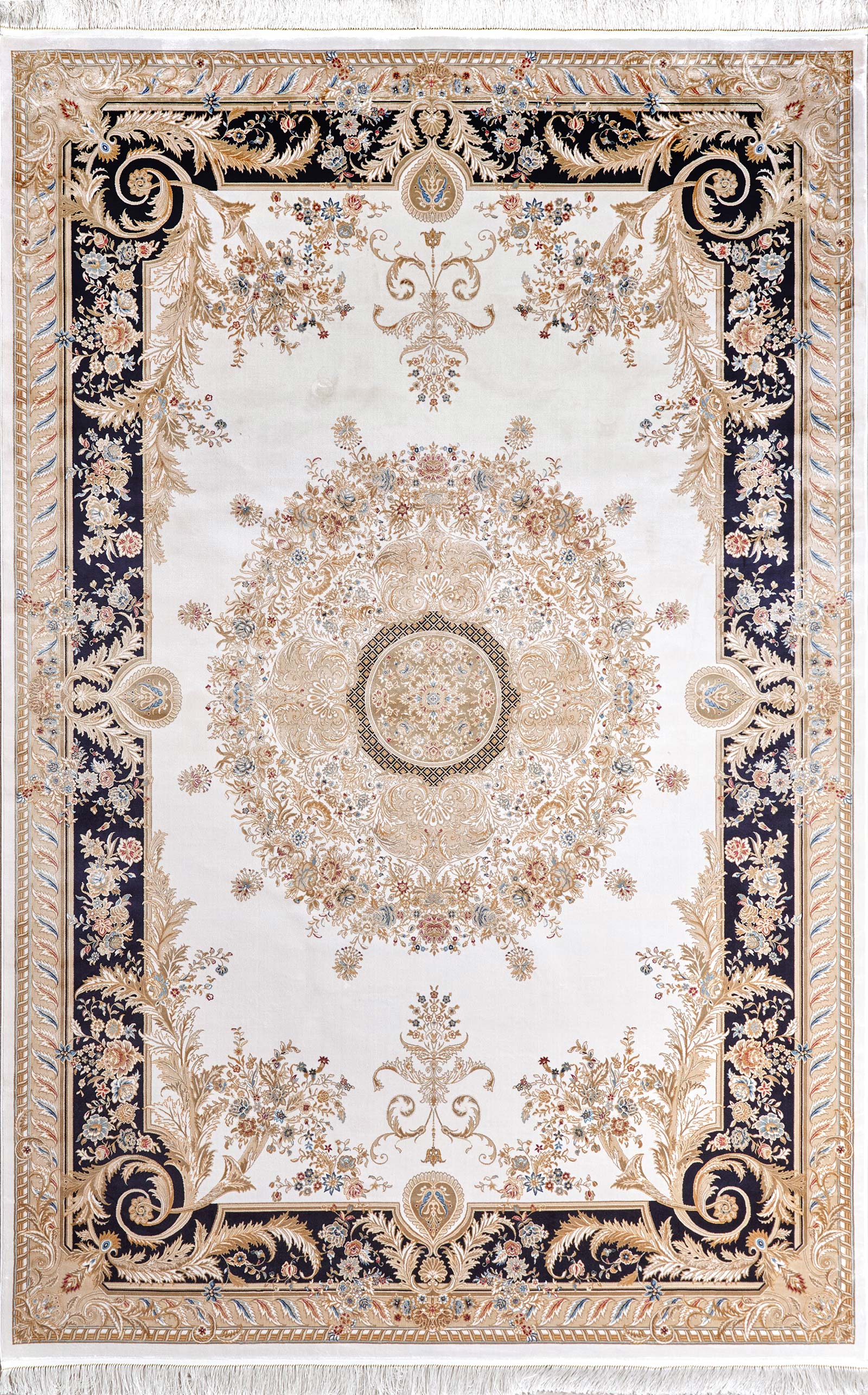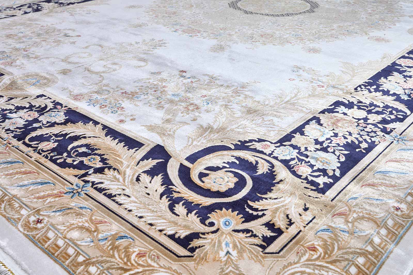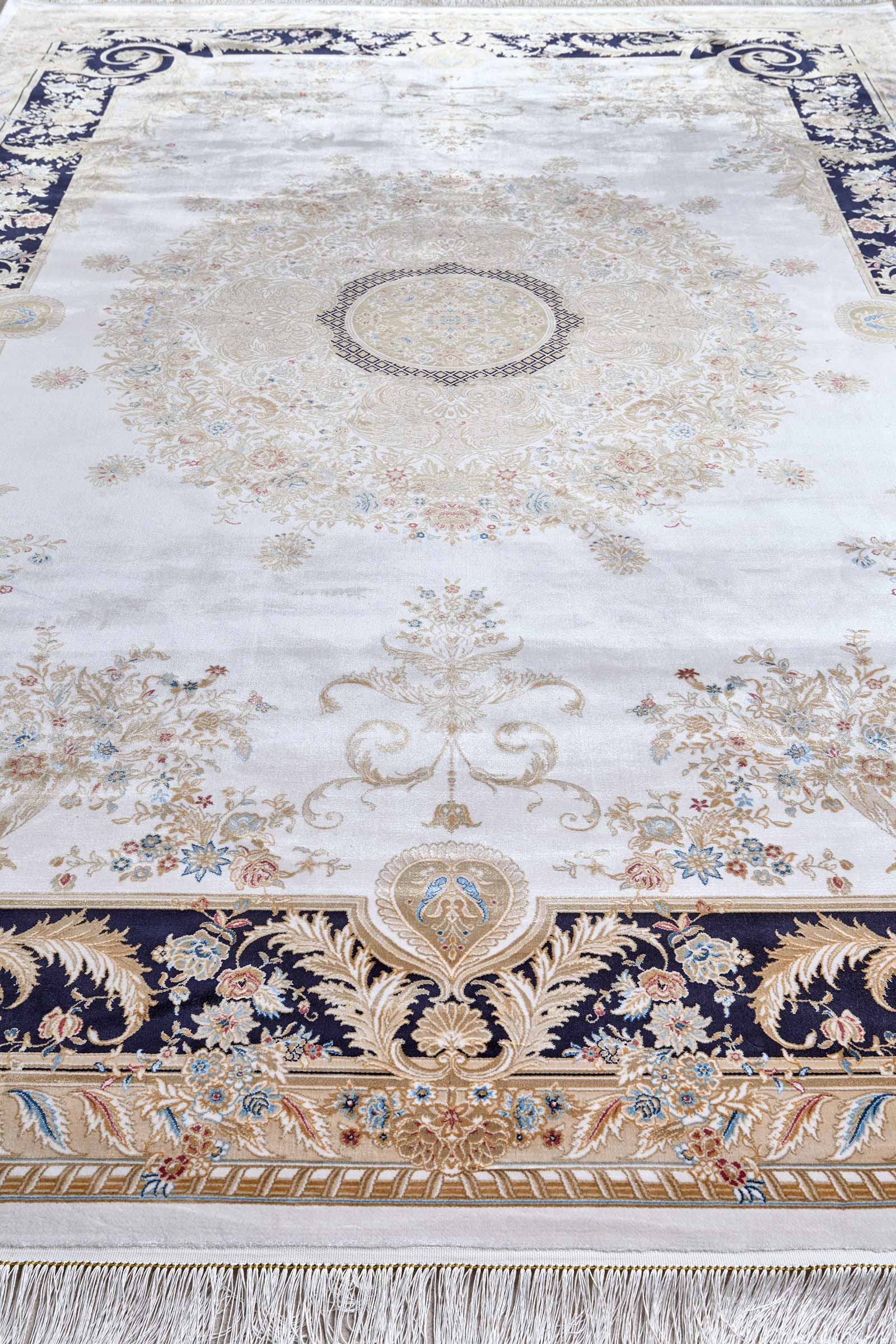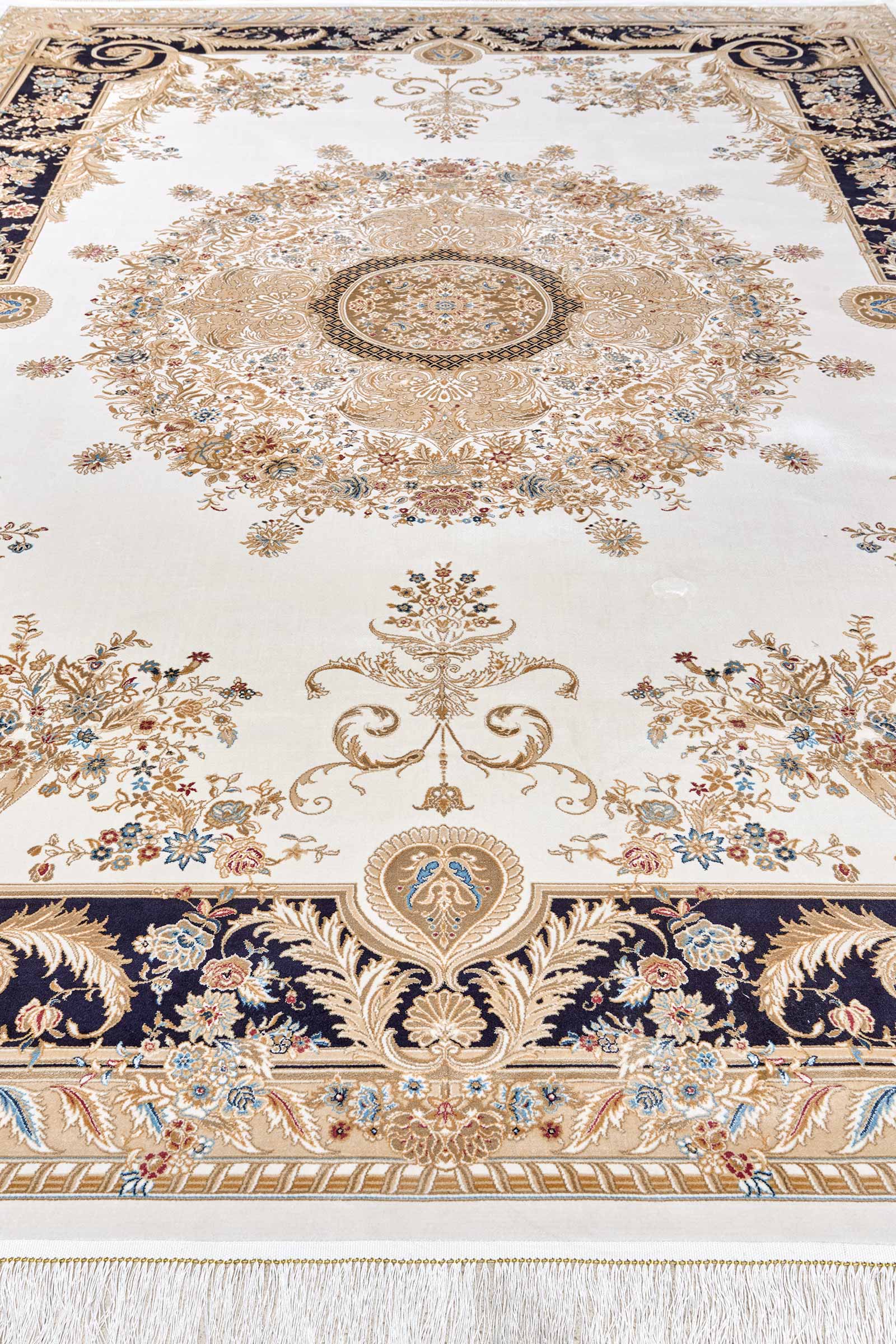 Классический ковёр с роскошной рамкой в стиле французского барокко. Бежево-золотистая палитра и изысканные флористические мотивы создают ощущение дворцовой элегантности. Идеален для интерьеров с характером.