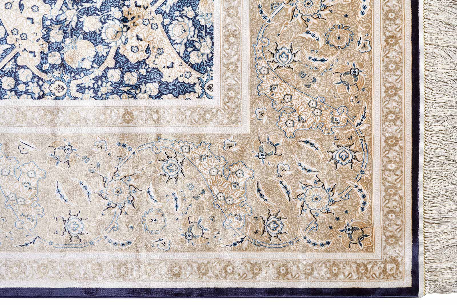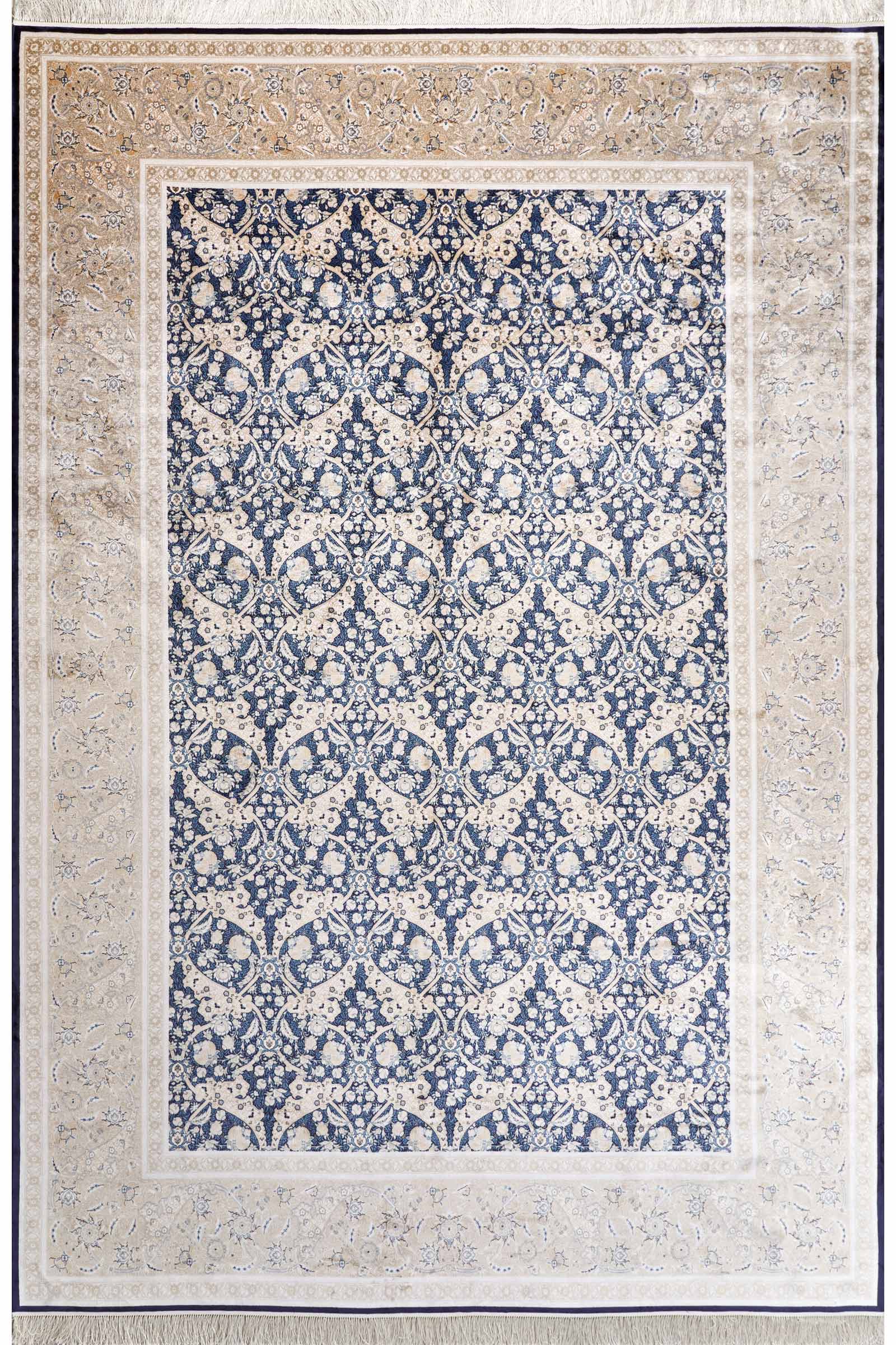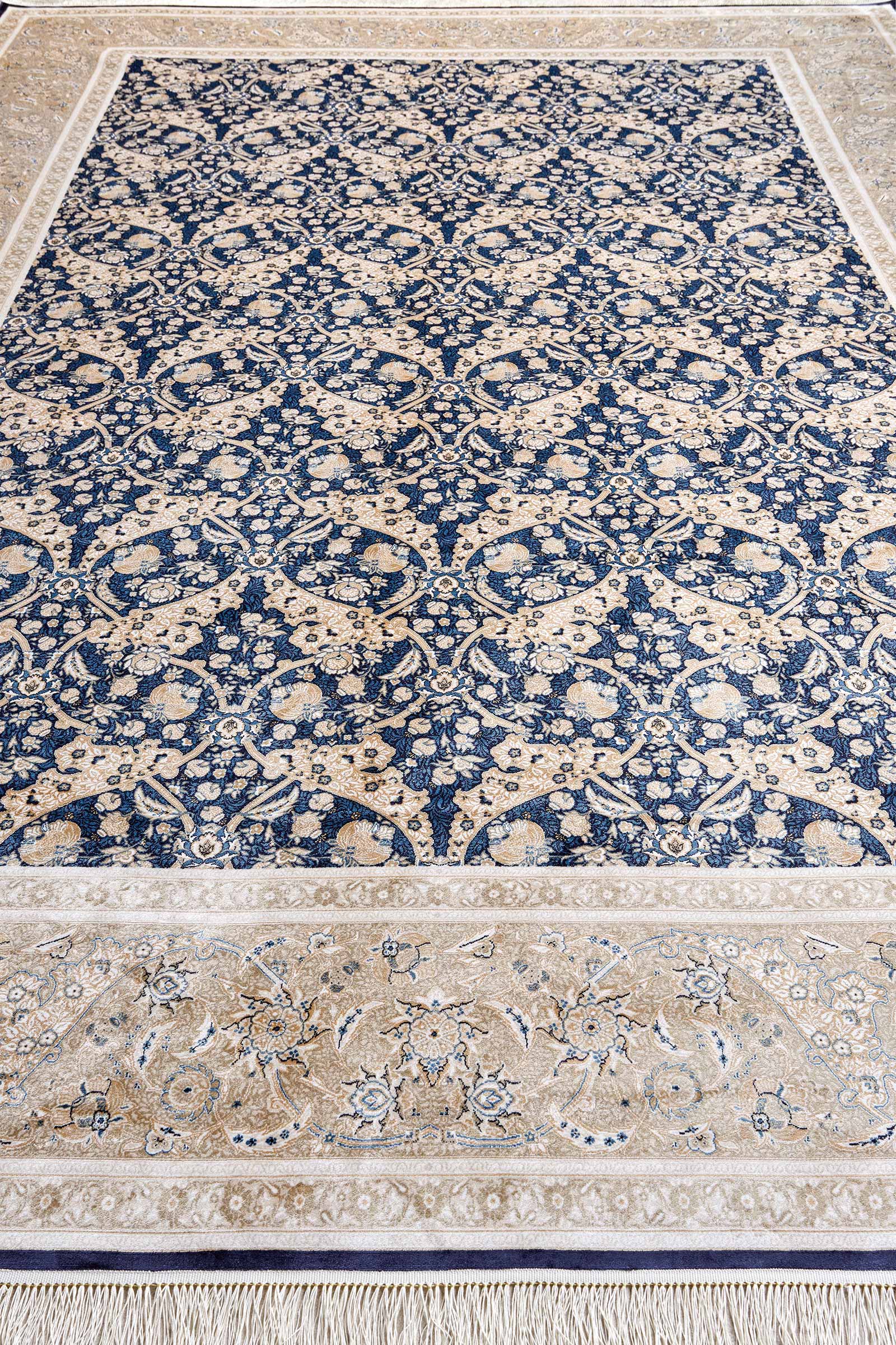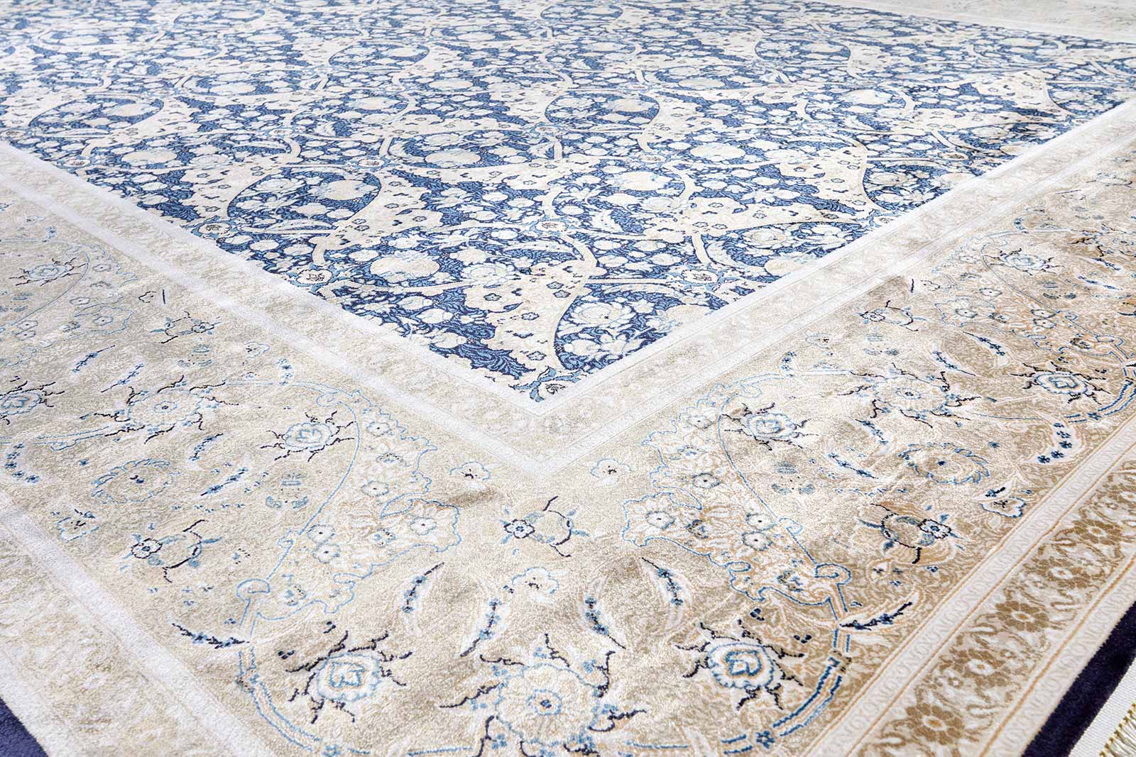 Ковёр с утончённым классическим орнаментом, сосредоточенным в центре, напоминает окно в другое время. Глубокий синий и небесный голубой играют на тёплом бежево-золотистом фоне, создающим эффект изысканной рамки вокруг изящного декоративного мотива.